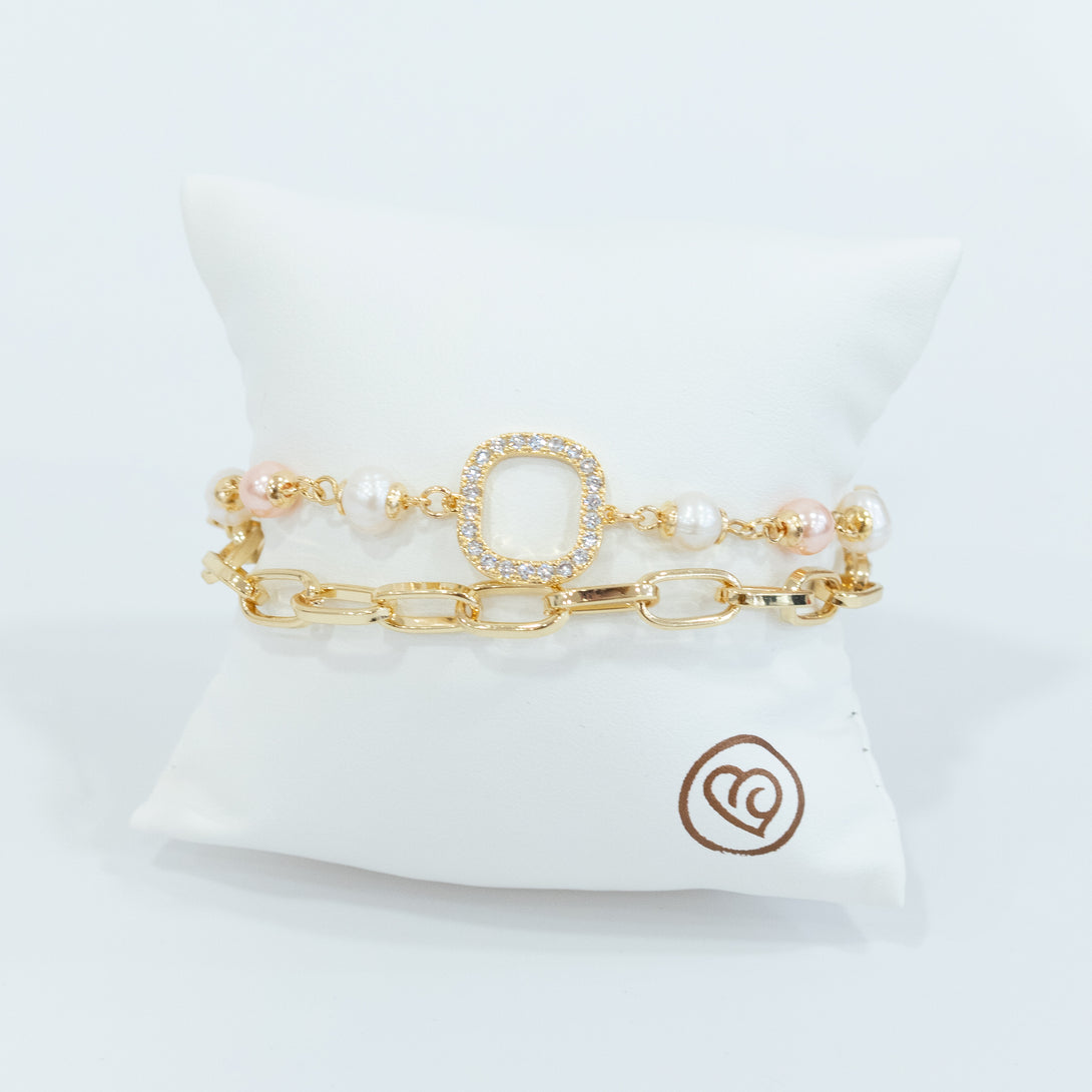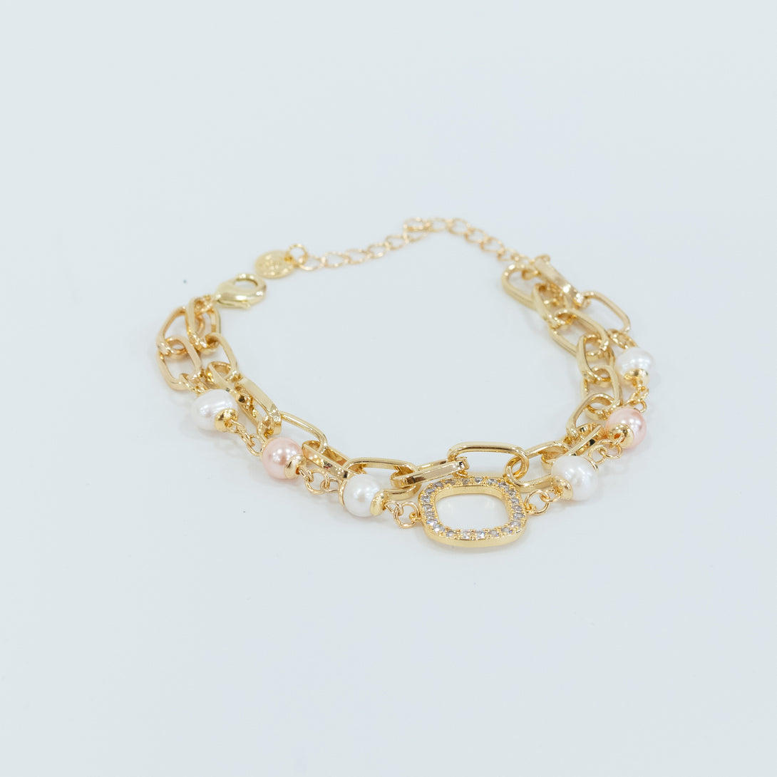 Bracciale Barbieri doppio filo in metallo placcato oro NICKEL FREE con cristalli e perle rosa e bianca. Chiusura con moschettone. Misura: 24 cm
