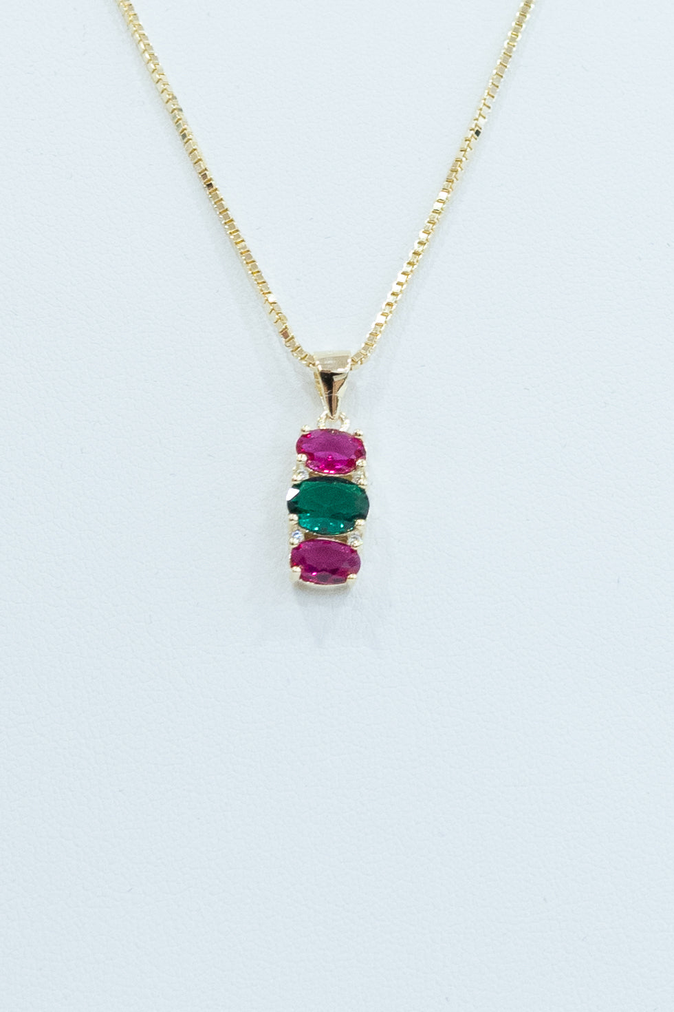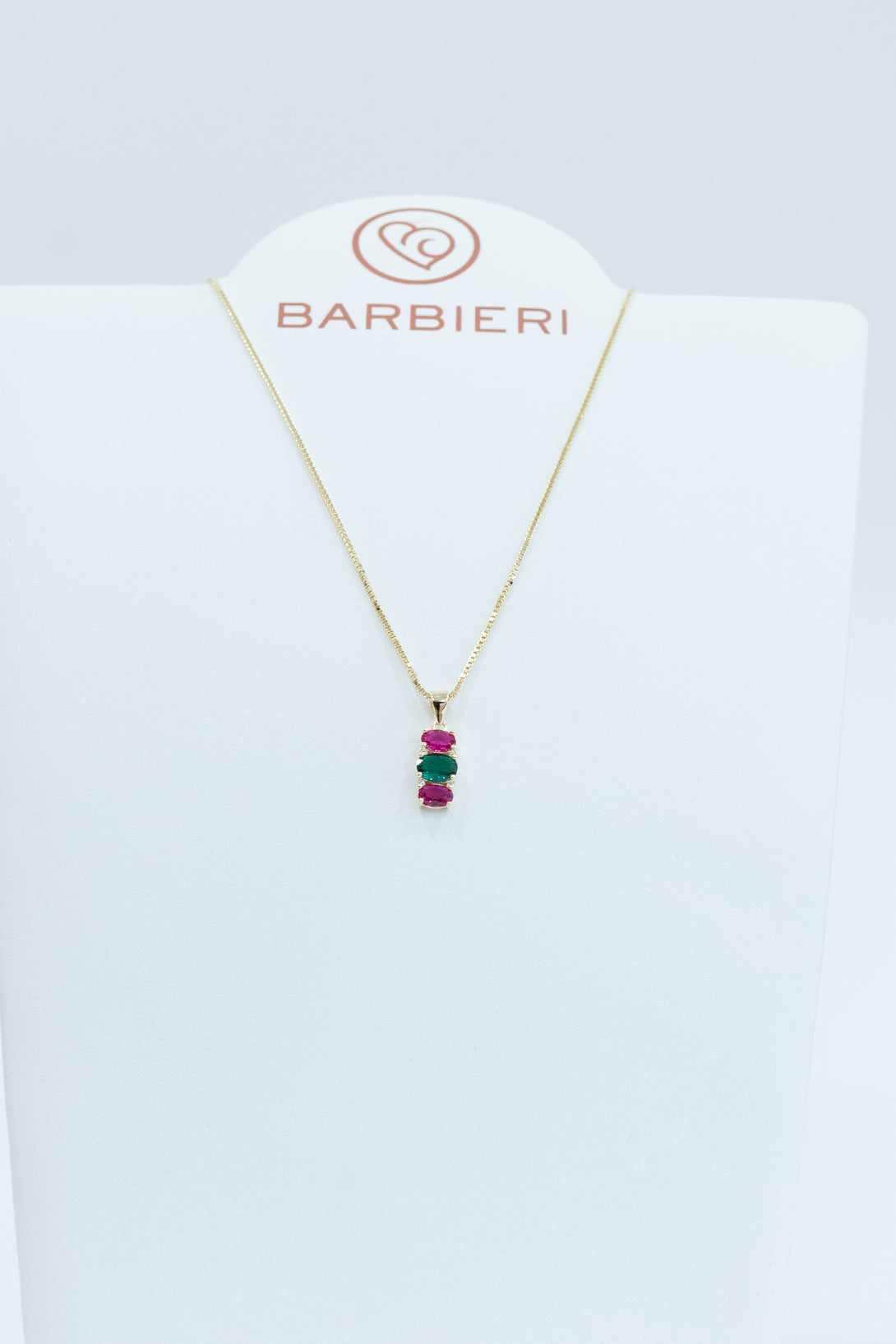Collana Barbieri in argento placcato oro NICKEL FREE con pendente con zirconi rosso e verde. Chiusura con moschettone. Misura: 40+10 cm