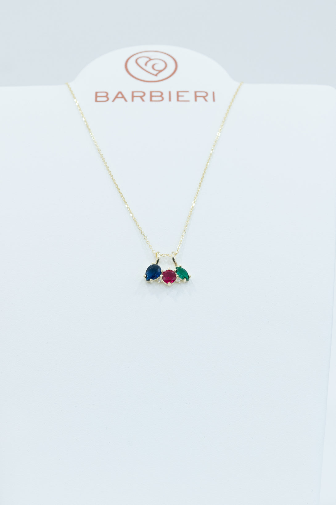 Collana Barbieri in argento placcato oro NICKEL FREE con pendente in tris di colori, blu, rosso e verde. Chiusura con moschettone. Misura: 40+10 cm