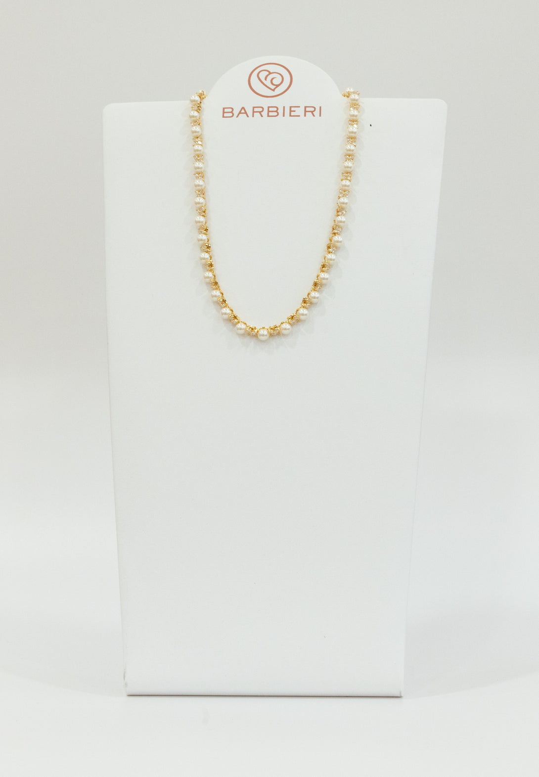 Collana girocollo Barbieri in metallo placcato oro NICKEL FREE con strass e perline. Chiusura con moschettone.