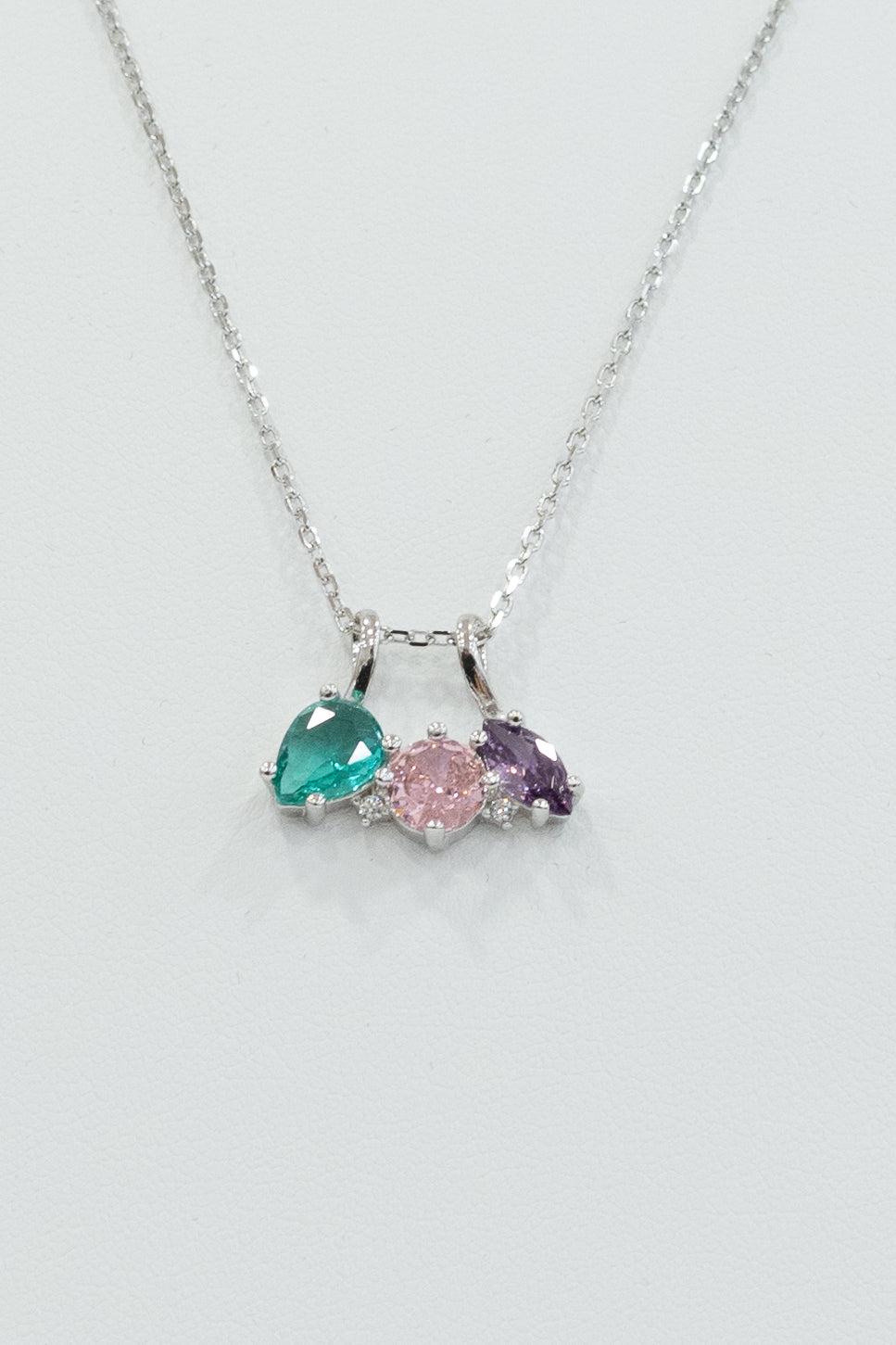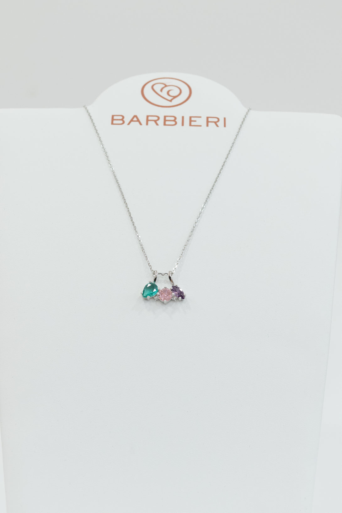 Collana Barbieri in argento rodiato NICKEL FREE con pendente tris di colori, verde, rosa e lilla. Chiusura con moschettone. Misura: 40+10 cm