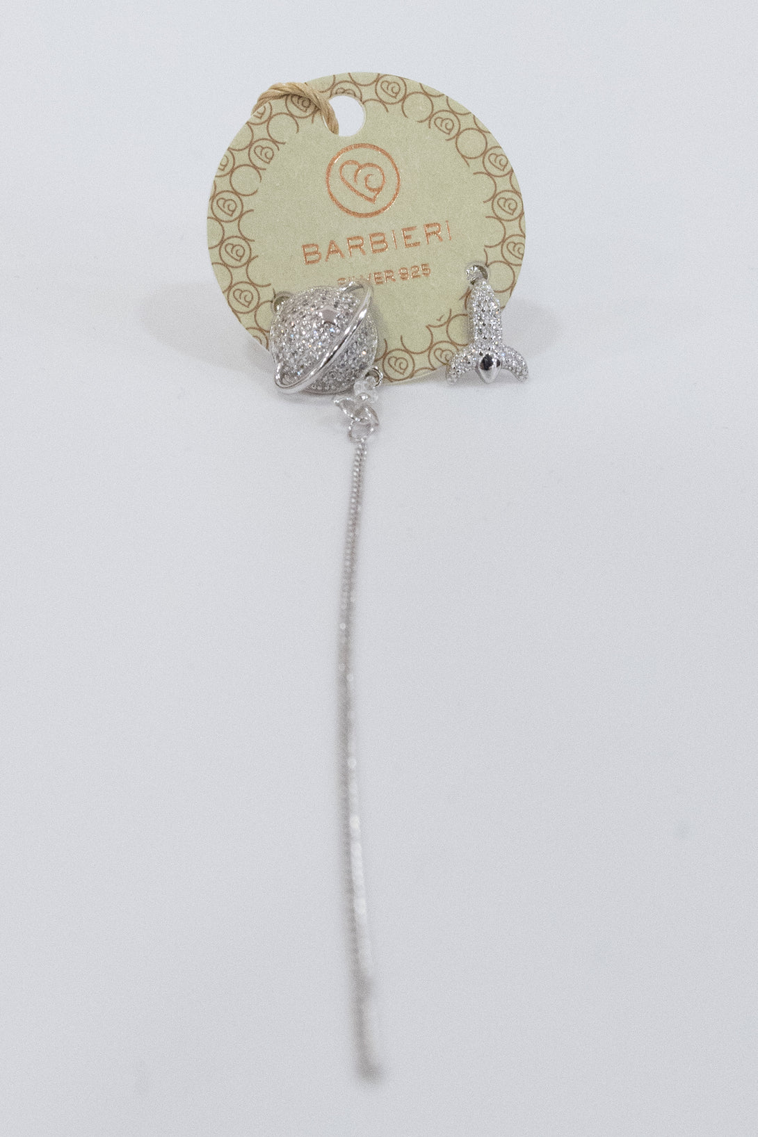 Orecchini a bottone Barbieri in metallo rodiato NICKEL FREE, con rocket e pianeta, con catenina pendente. Chiusura classica con vite a farfalla. Lunghezza del pendente: 10cm.