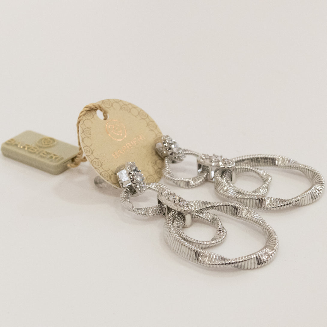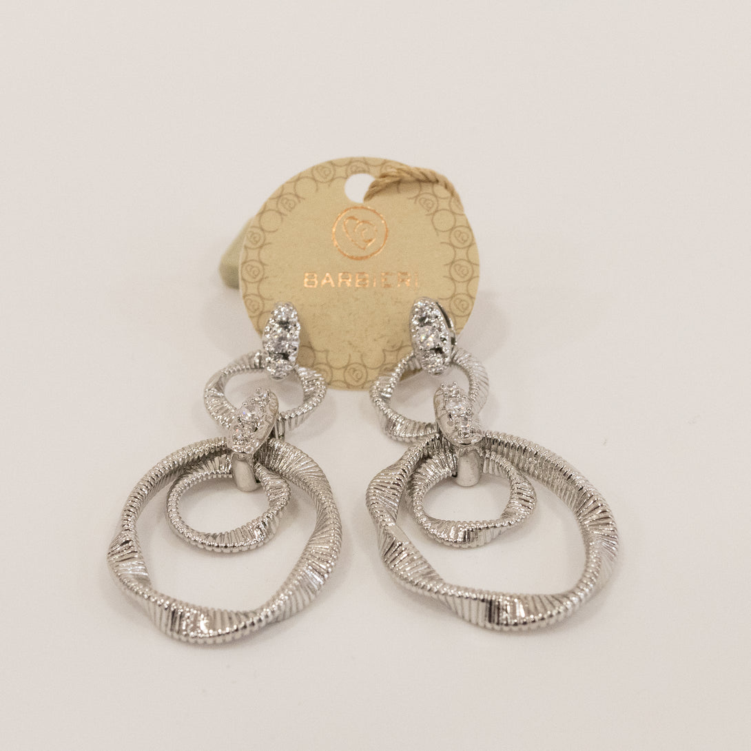 Orecchini pendenti Barbieri in metallo rodiato NICKEL FREE, con anelli. Chiusura classica con vite a farfalla. Lunghezza del pendente: 6cm.