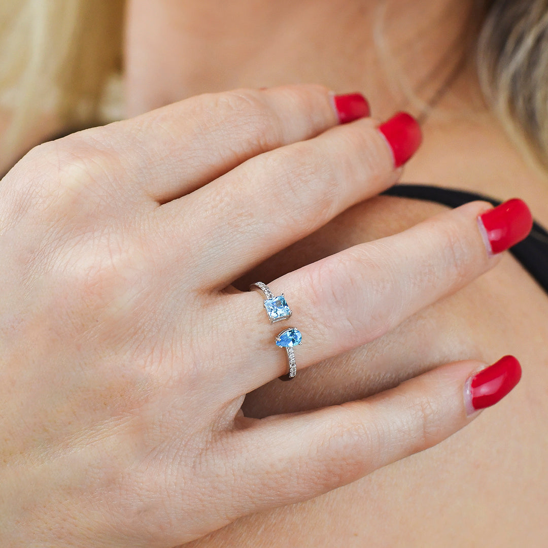 Anello in argento rodiato con fasce di zirconi che sorreggono due zirconi sfaccettati di colore acquamarina a goccia e quadrato.
