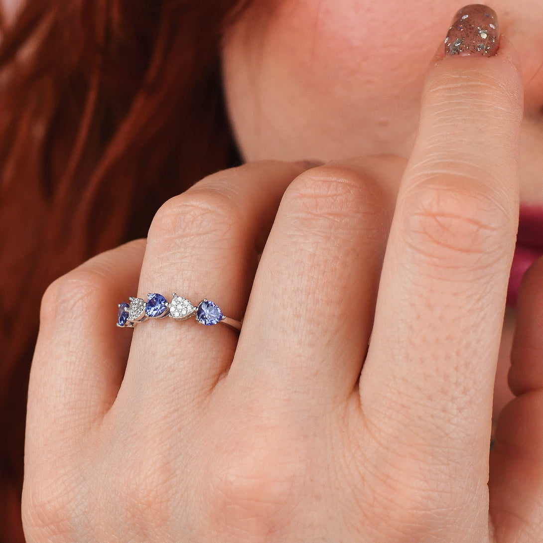 Anello in argento rodiato con zirconi centrali a forma di cuore, di colore tanzanite alternati a cuori di zirconi di colore bianco.