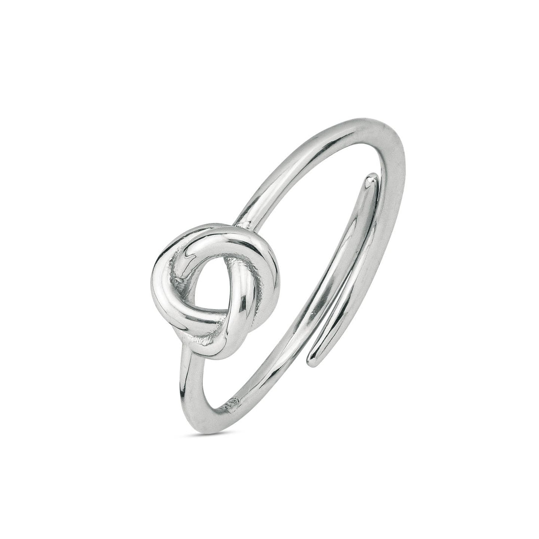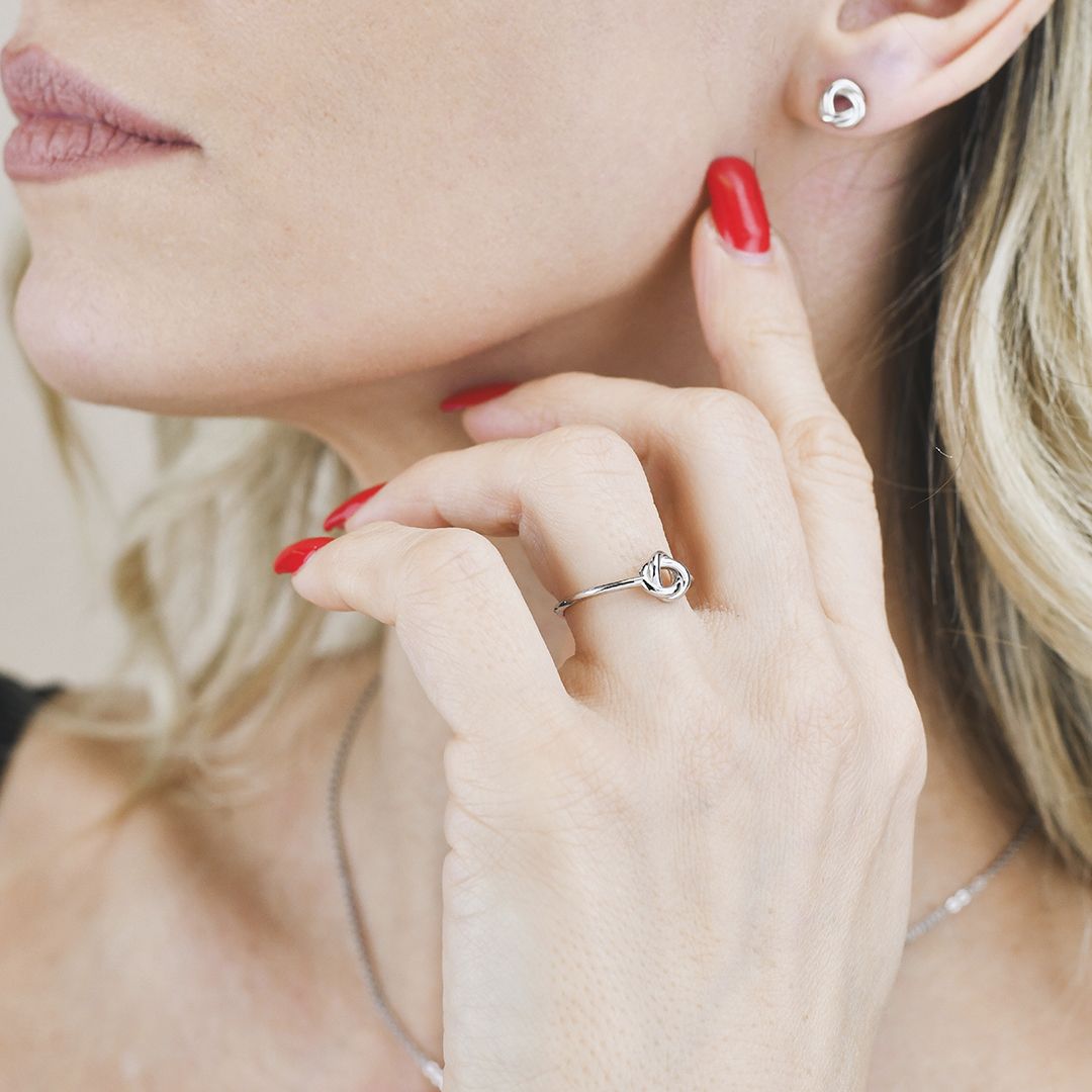 Anello in argento rodiato con centrale intrecciato a forma di nodo.
