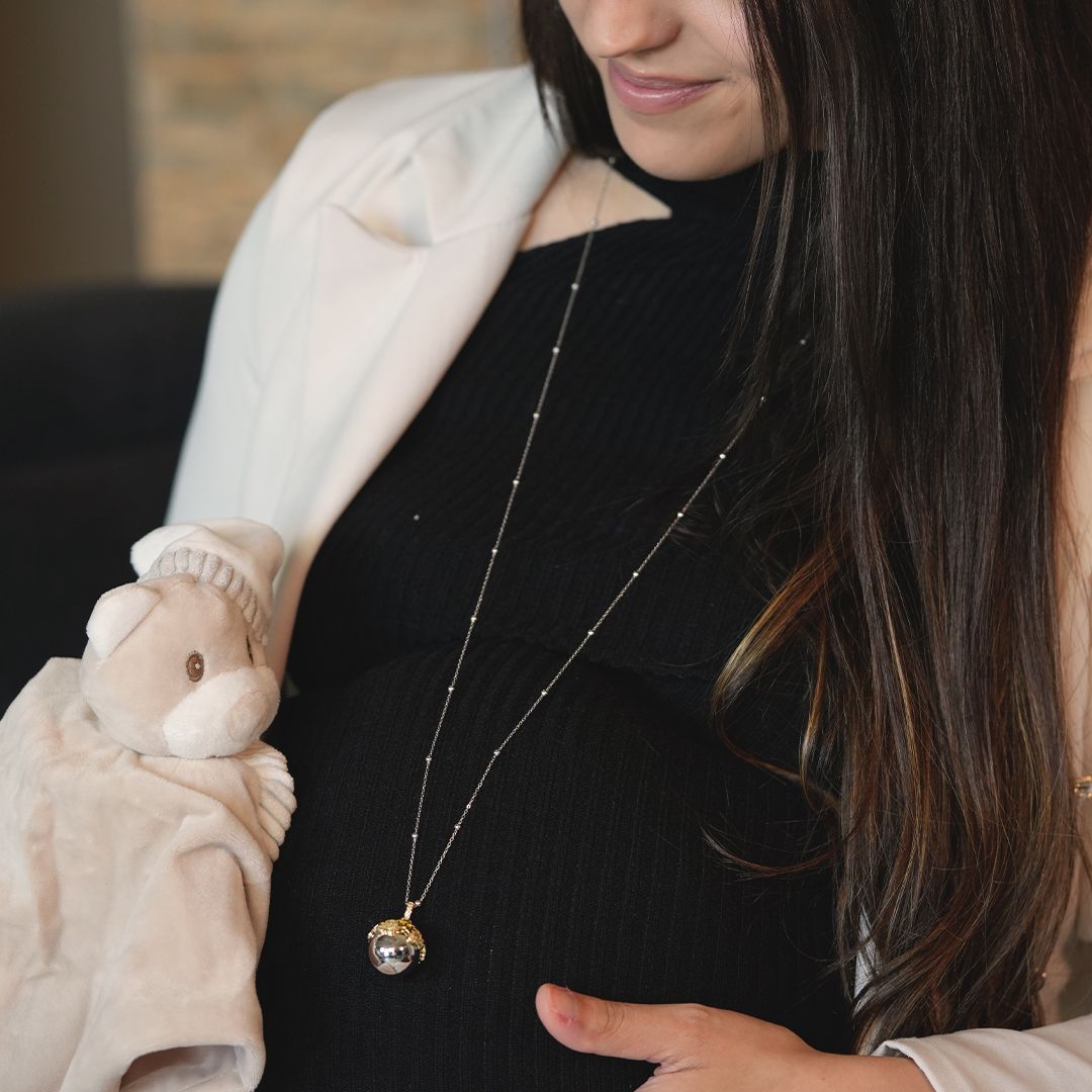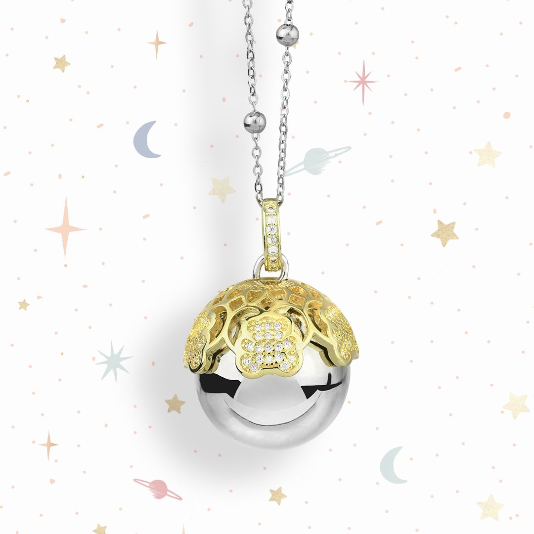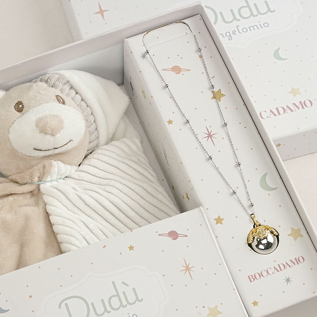 Collana con ciondolo sonoro e coppetta placcata oro giallo con orsetti di pavè di zirconi. La collana per la neomamma è inserita all'interno di una confezione dedicata che contiene anche un tenero peluche-copertina per il neonato.