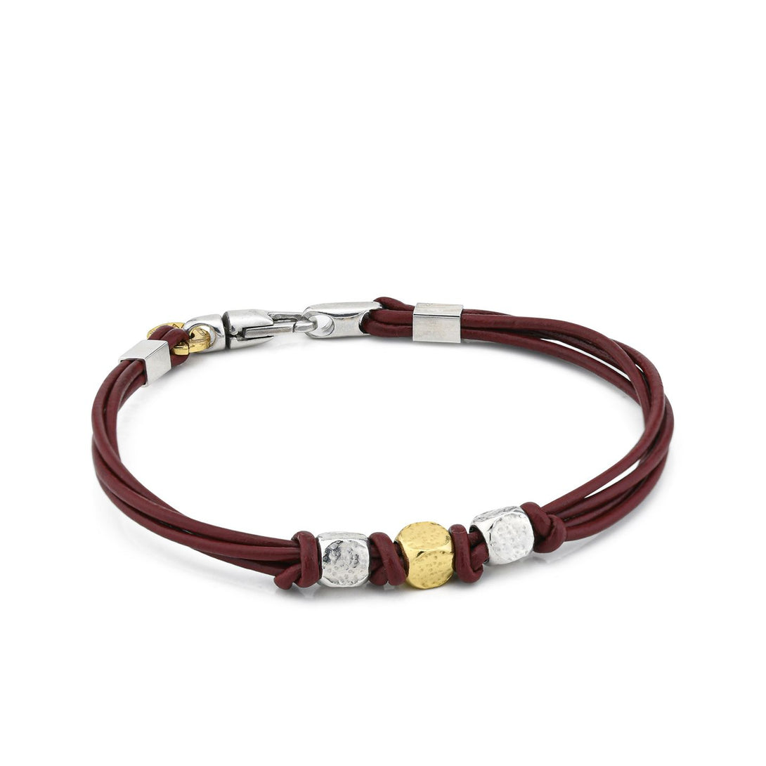 Bracciale in fili di cuoio intrecciato bordeaux con chiusura in argento rodiato, cubotti martellati in argento rodiato e cubotto centrale placcato oro giallo.