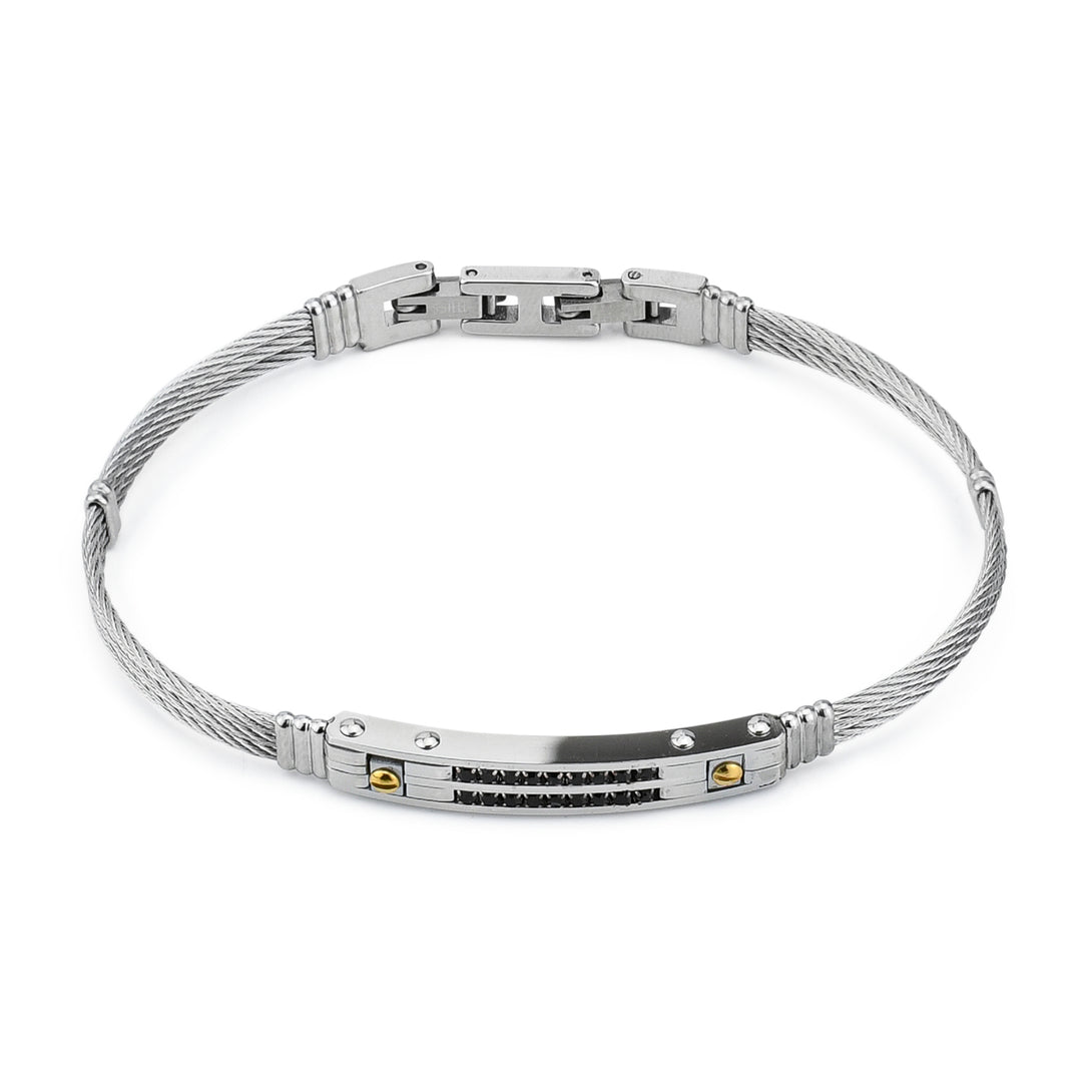 Bracciale in acciaio a doppio cordino in acciaio e centrale in acciaio con pietre Cubic zirconia nera incastonati.