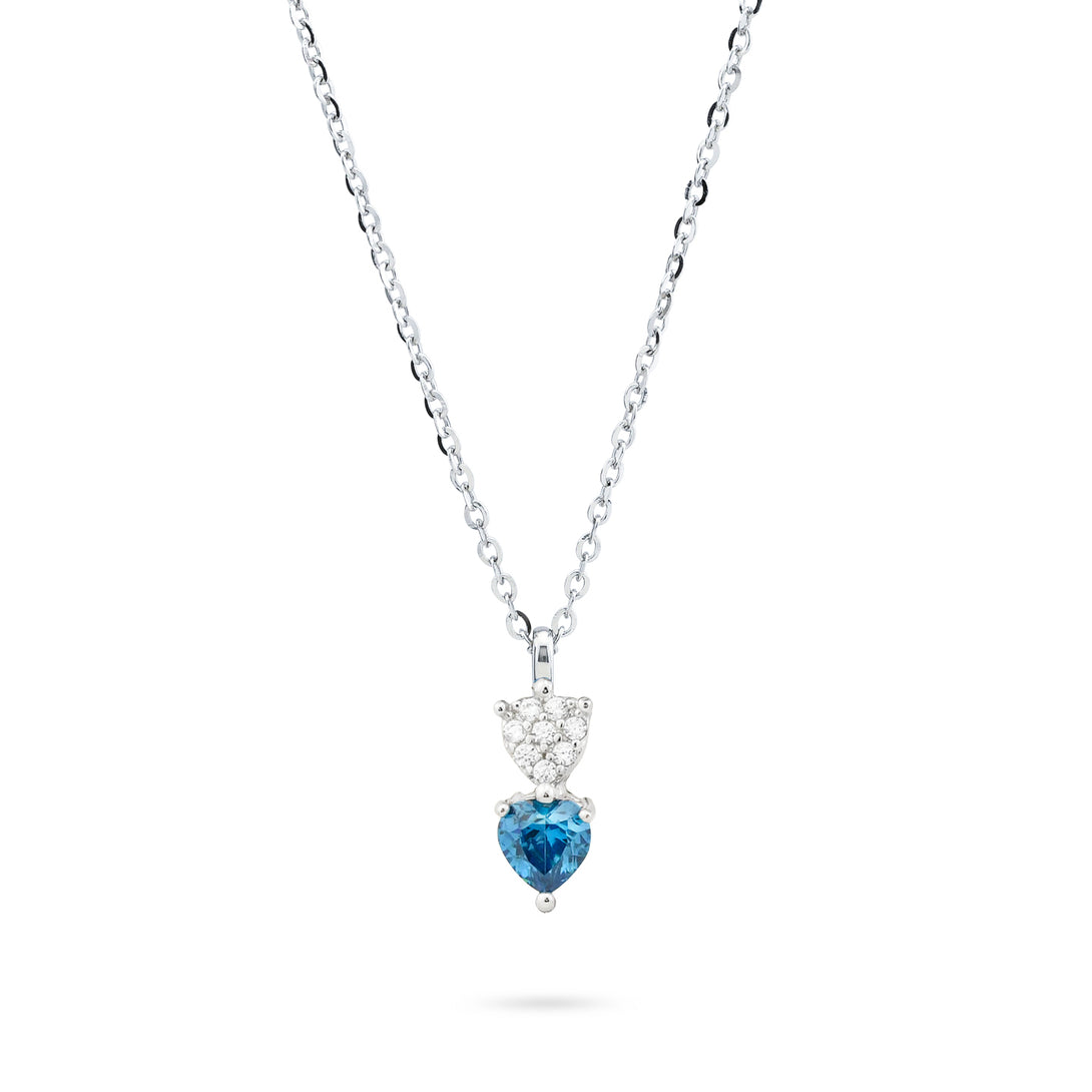 Collana in argento rodiato con pendente di due cuori di zirconi di colore bianco e blu.
