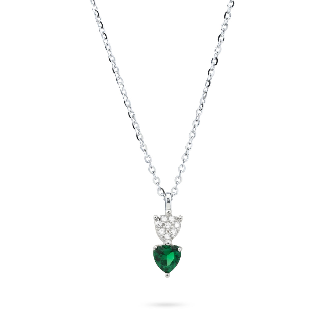 Collana in argento rodiato con pendente di due cuori di zirconi di colore bianco e verde.