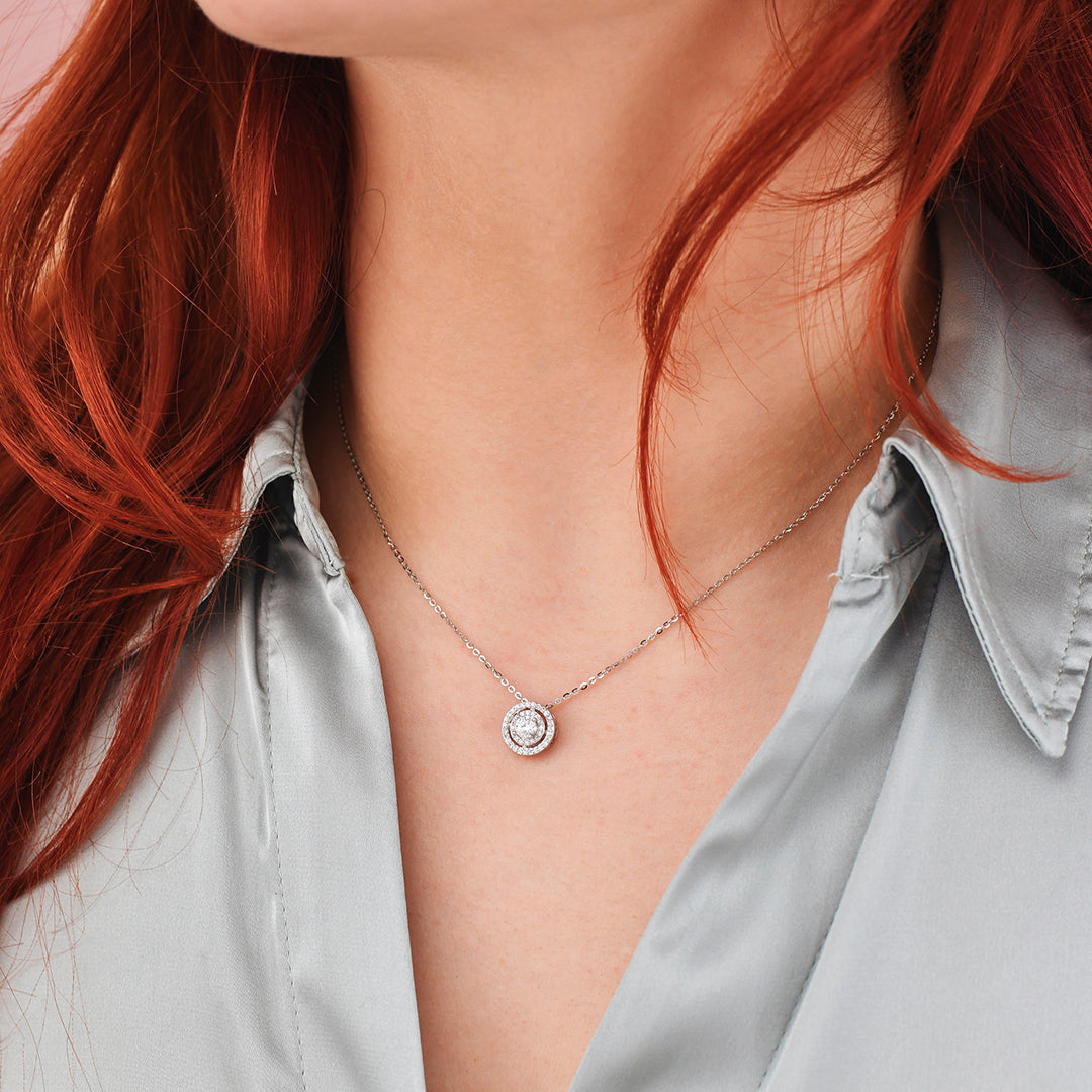 Collana in argento rodiato con zircone pendente tondo di colore verde circondato da un doppia fila di zirconi.