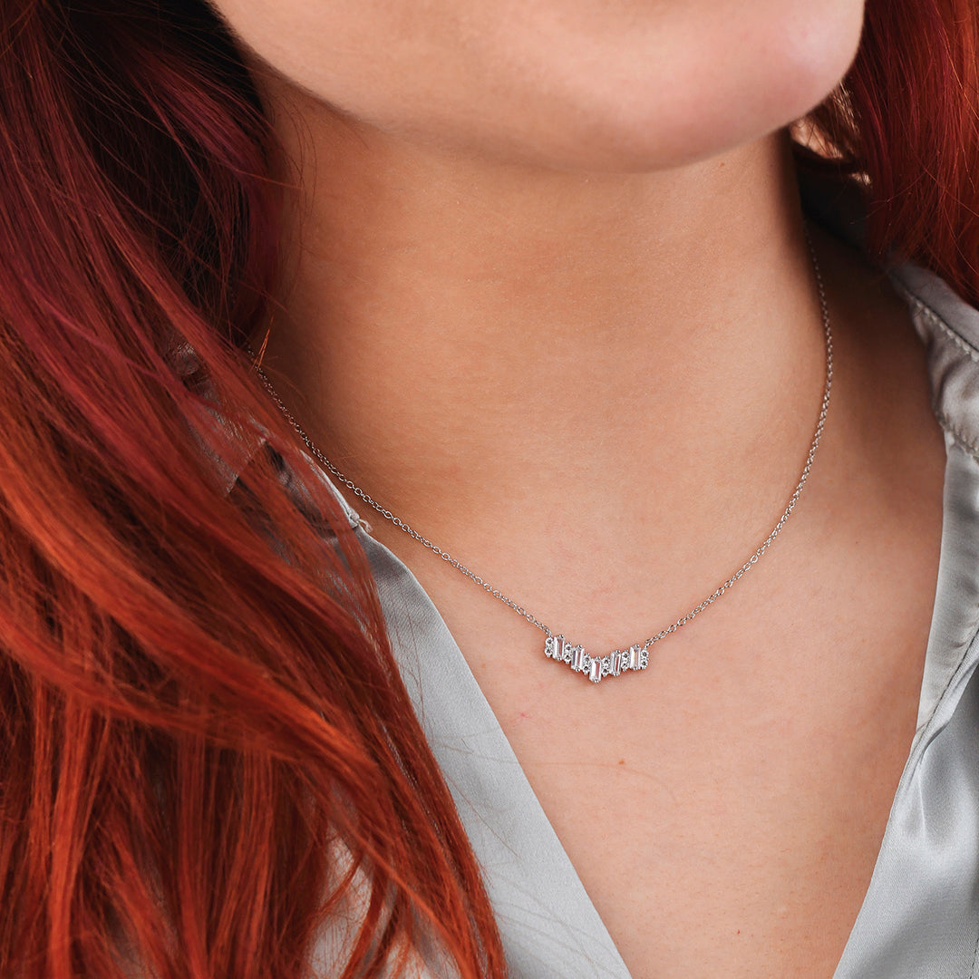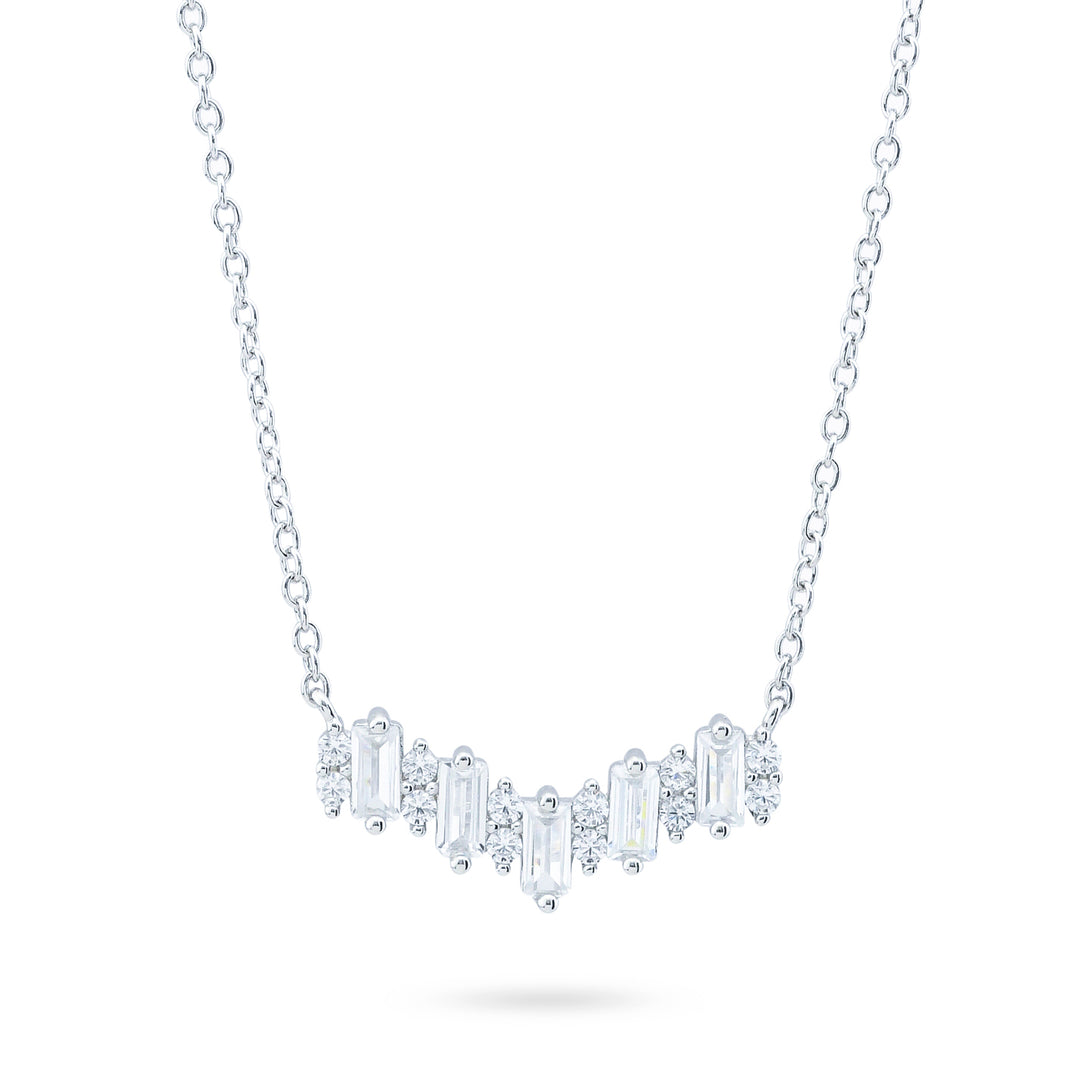 Collana in argento rodiato con cinque zirconi centrali, taglio baguette, di colore verde alternati a inserti di zirconi.
