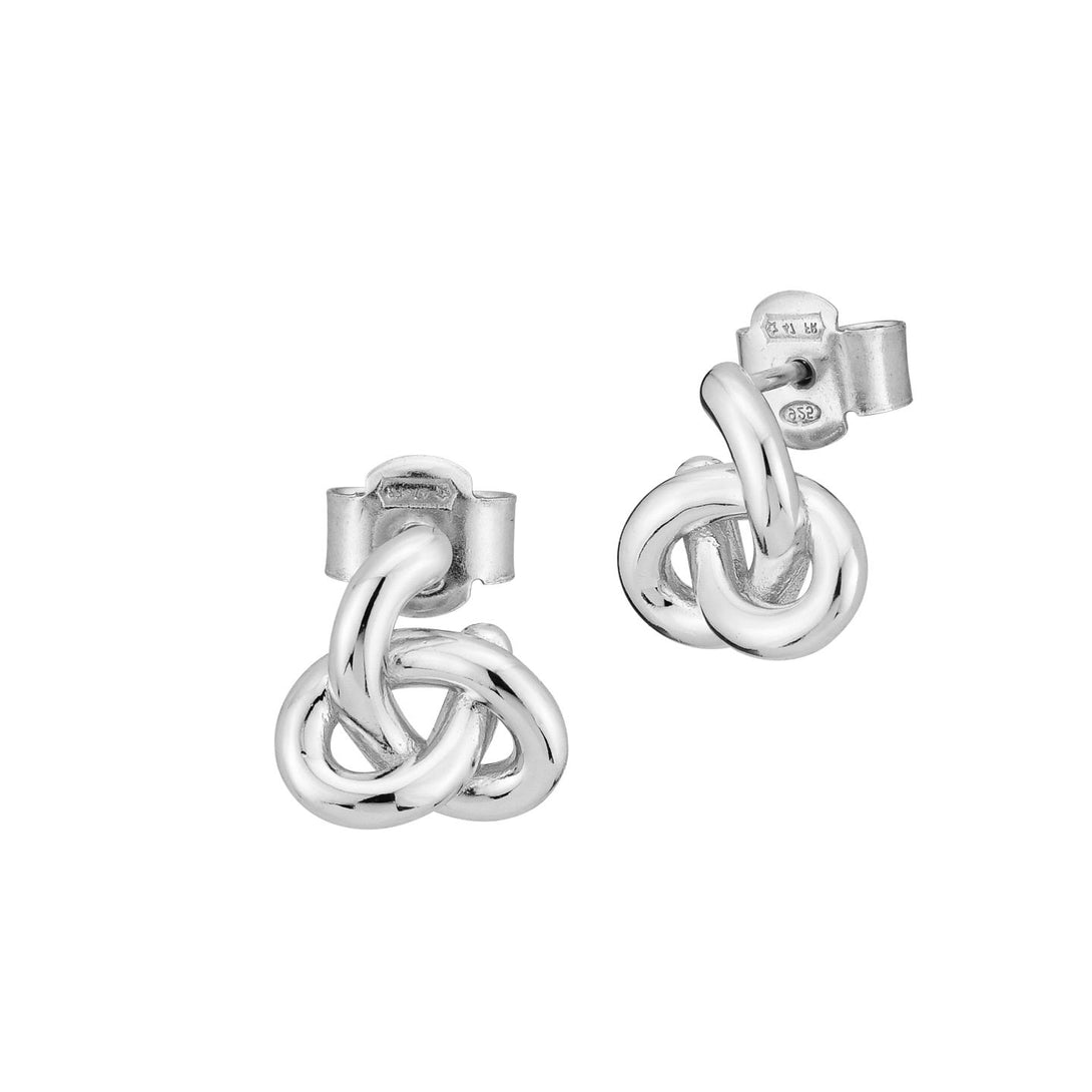 Orecchini in argento rodiato con centrali intrecciati a nodo doppio.