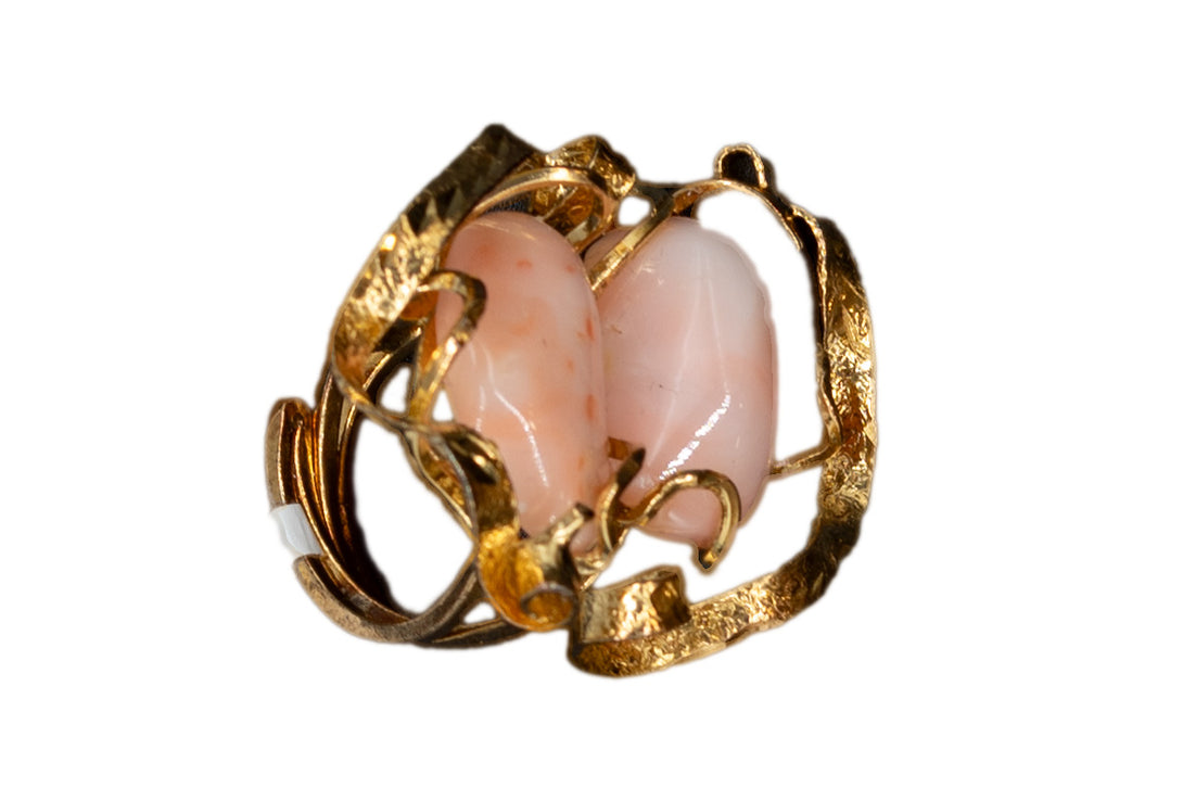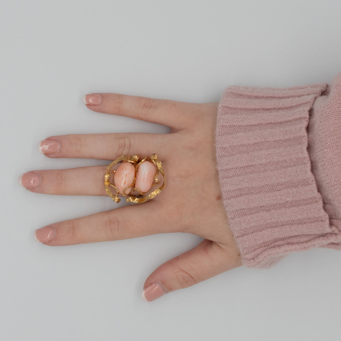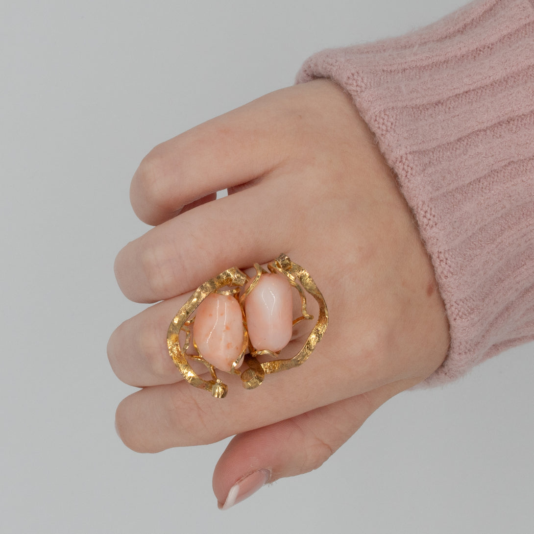 Anello Confuorto in argento dorato e corallo rosa. Misura regolabile