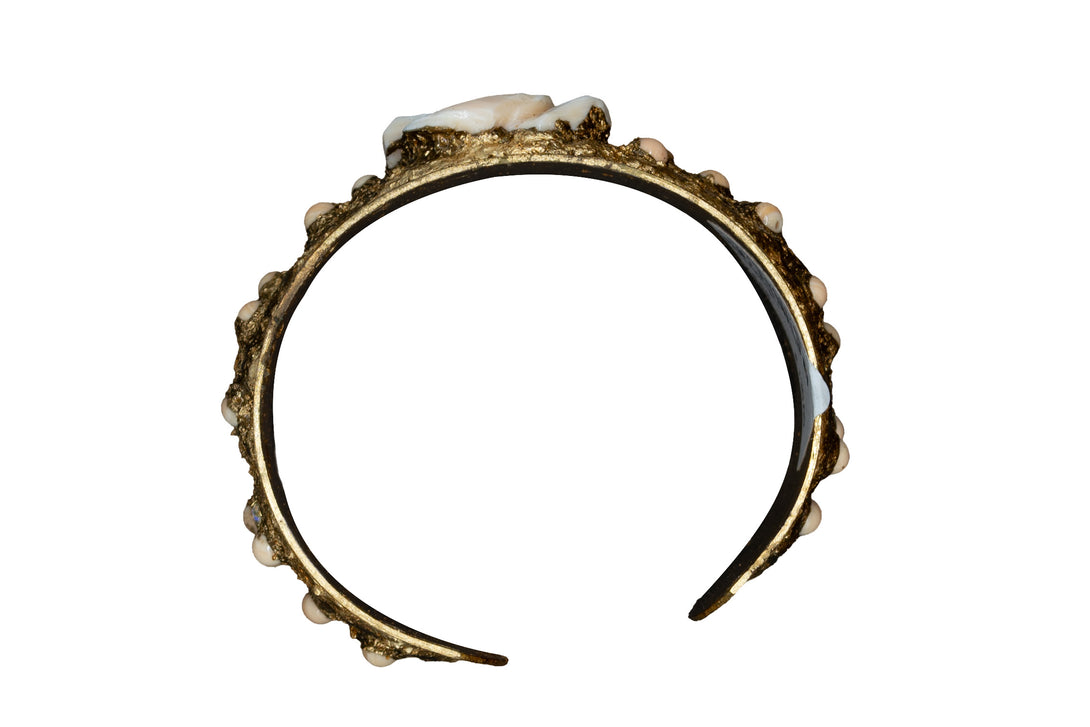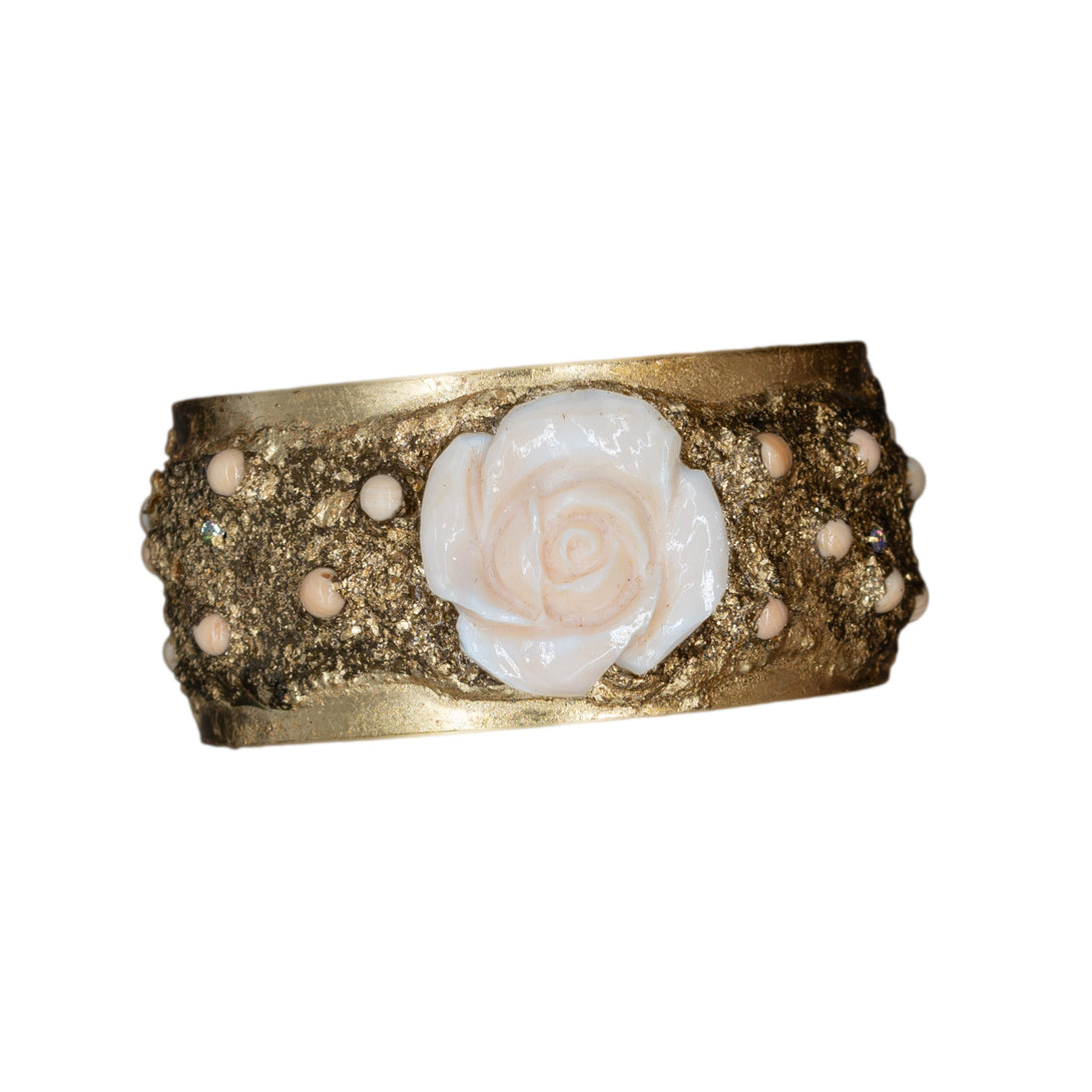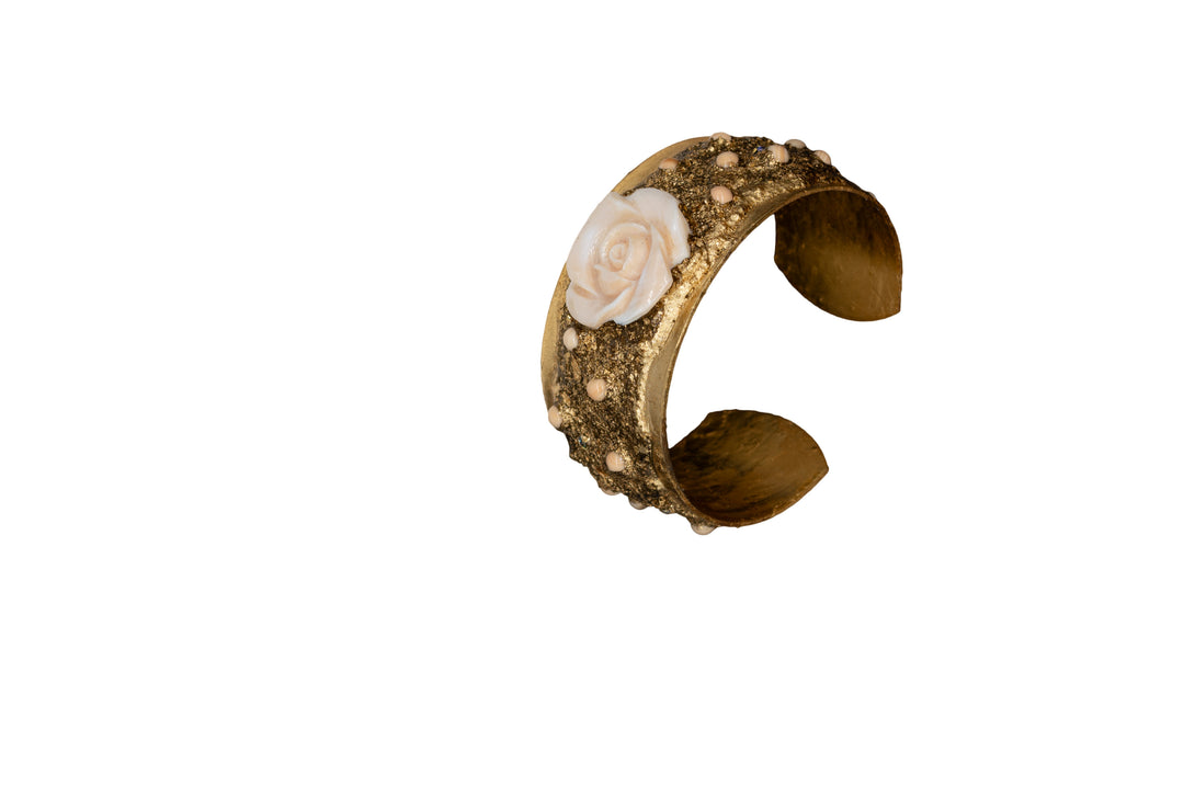 Bracciale Confuorto con fascia in ottone dorato e centrale con fiore in pasta di conchiglia rosa realizzato a mano