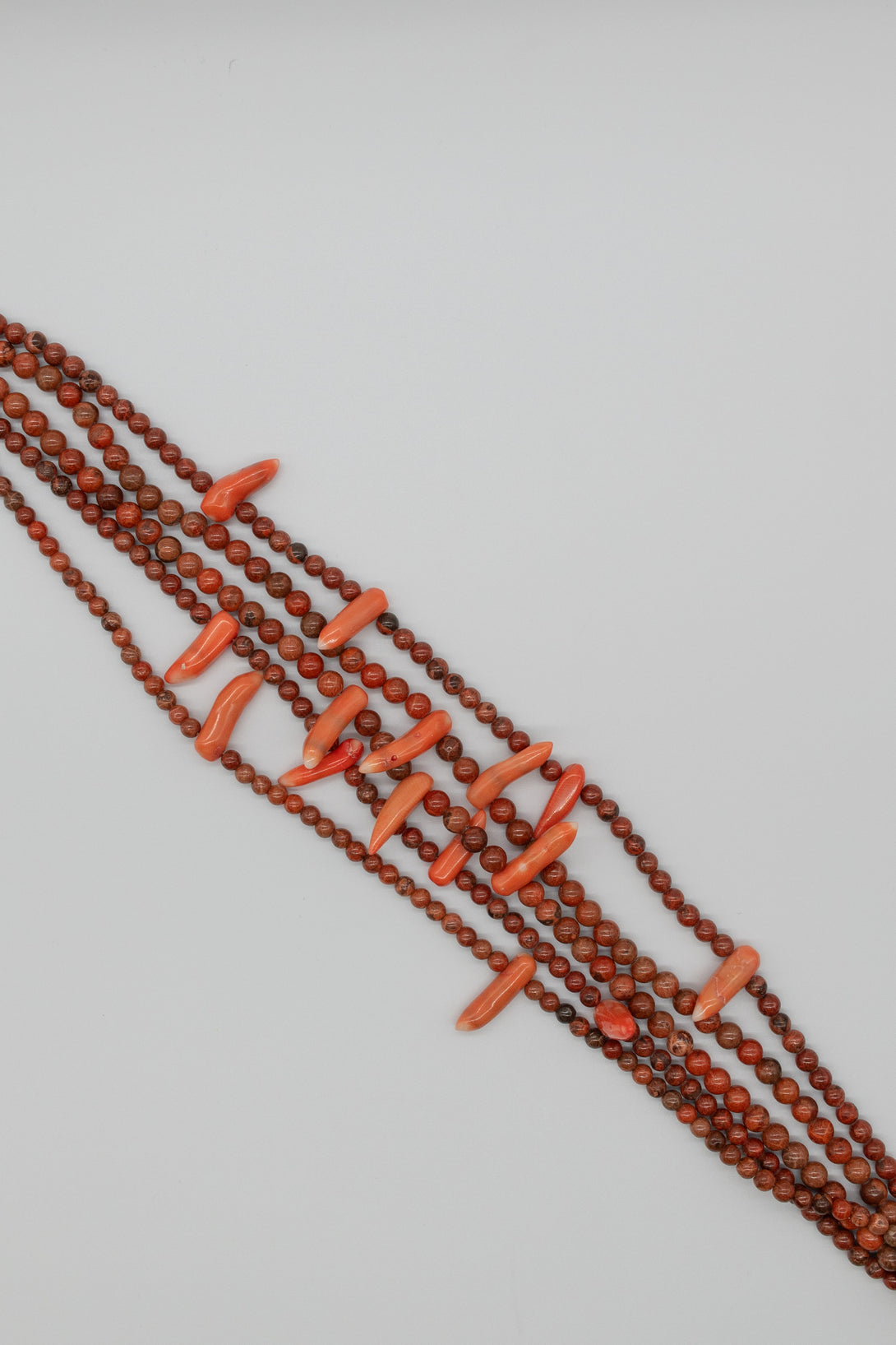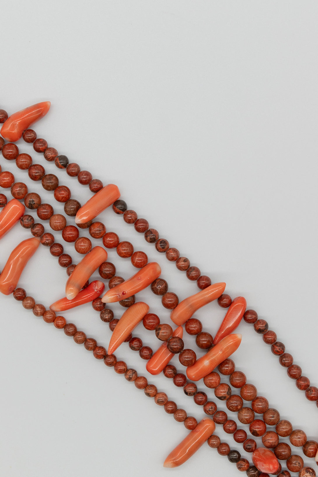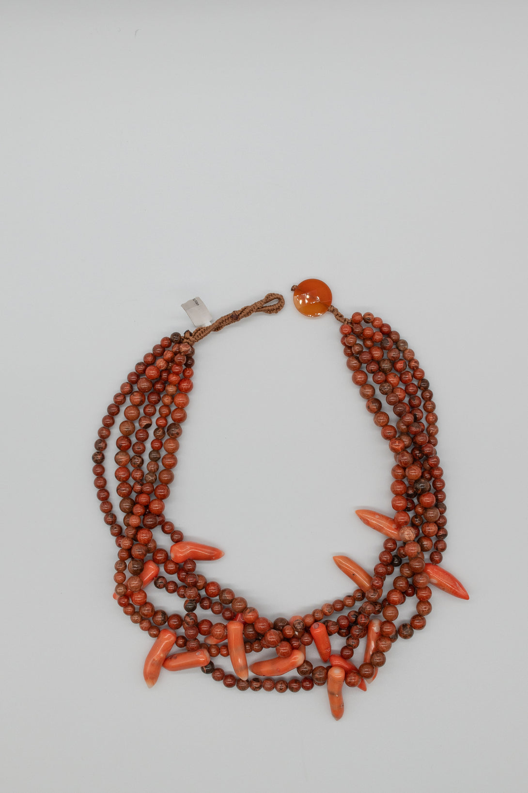 Collana girocollo Confuorto, 5 fili, con corni in radice di corallo. Chiusura in asola con quarzo.
