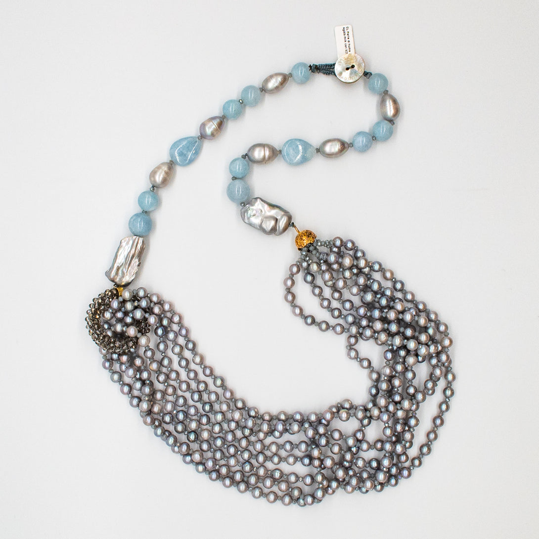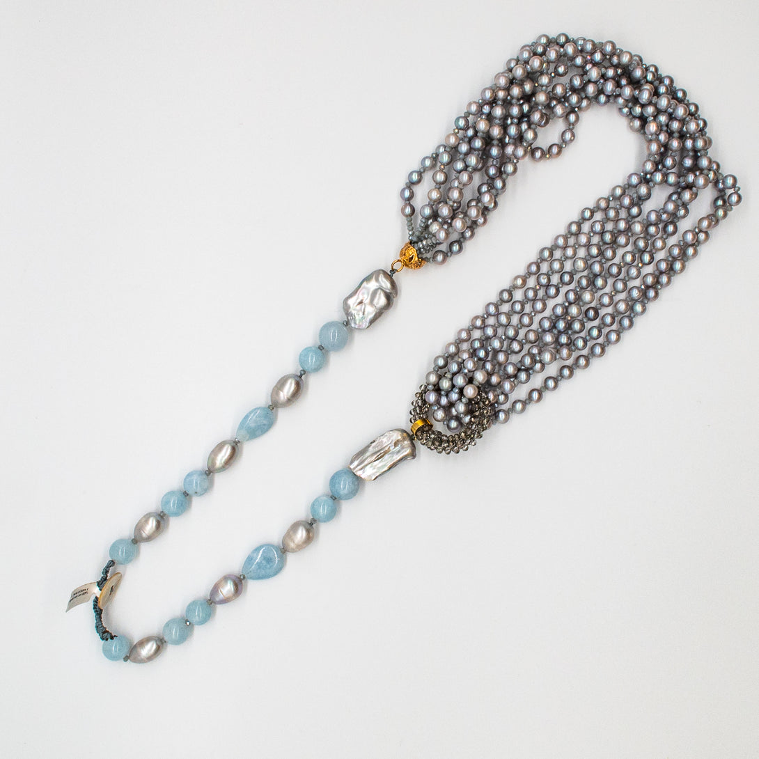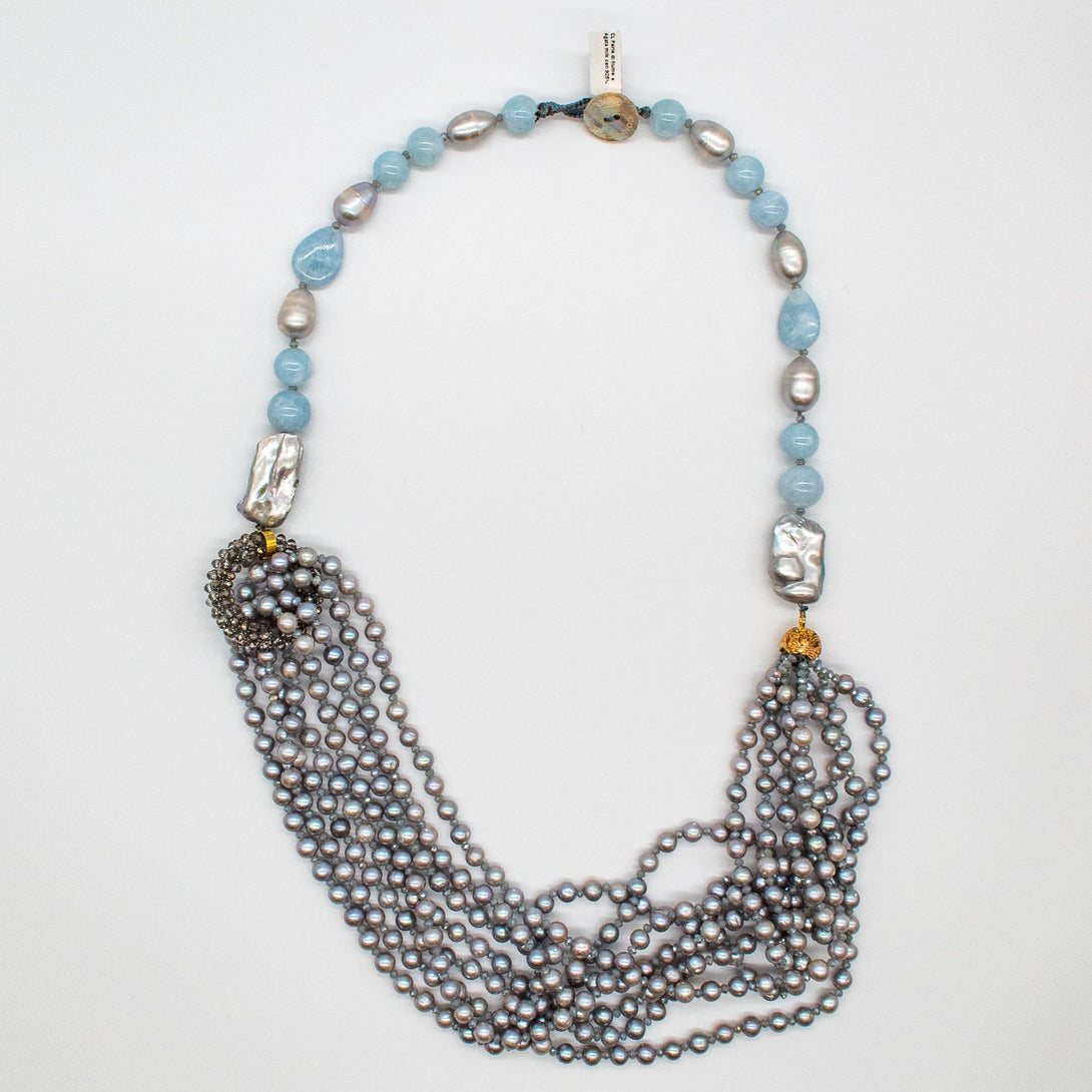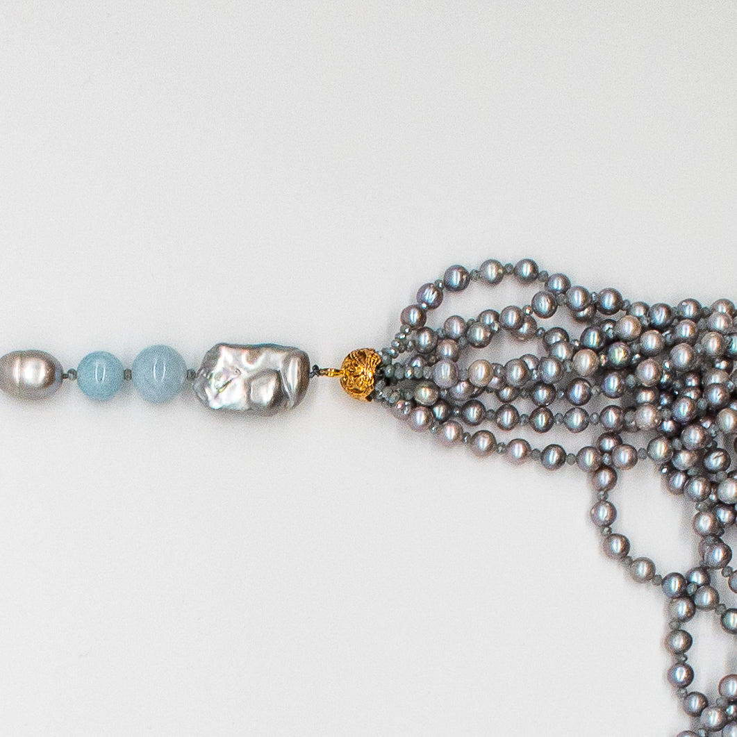 Collana Confuorto con per di fiume mutifilo e agata milk con dettagli in argento dorato 925. Chiusura con asola in bottone in madreperla. Lunghezza da 45cm