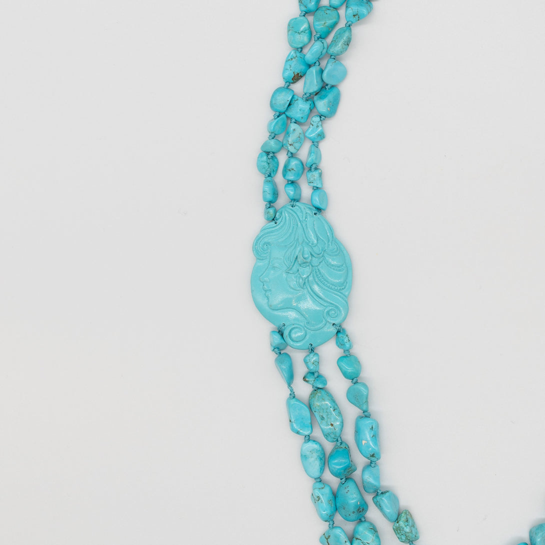 Collana Confuorto con tre fili in magnesite e cammeo laterale con volto di donna. Chiusura con asola. Lunghezza collana chiusa: 40cm