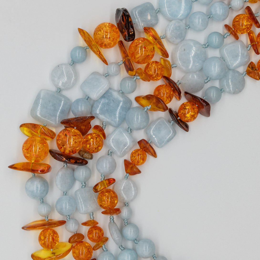 Collana Confuorto, 5 fili, in azzurrite e ambra. Chiusura con asola. Lunghezza collana chiusa: 45 cm