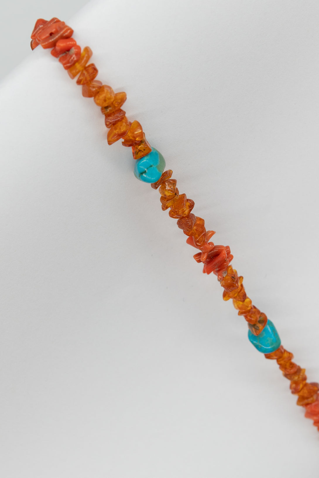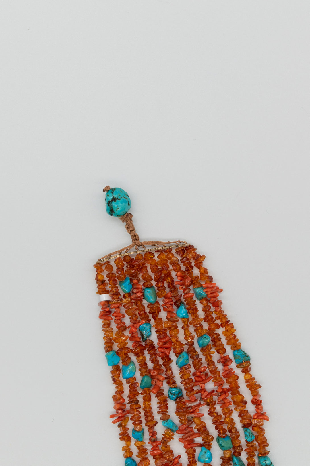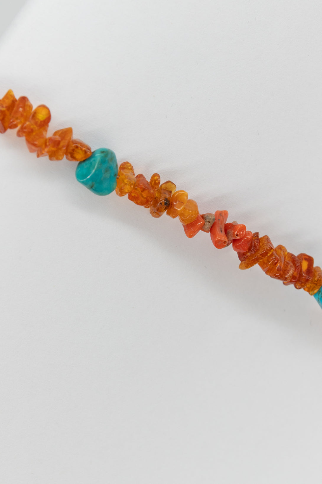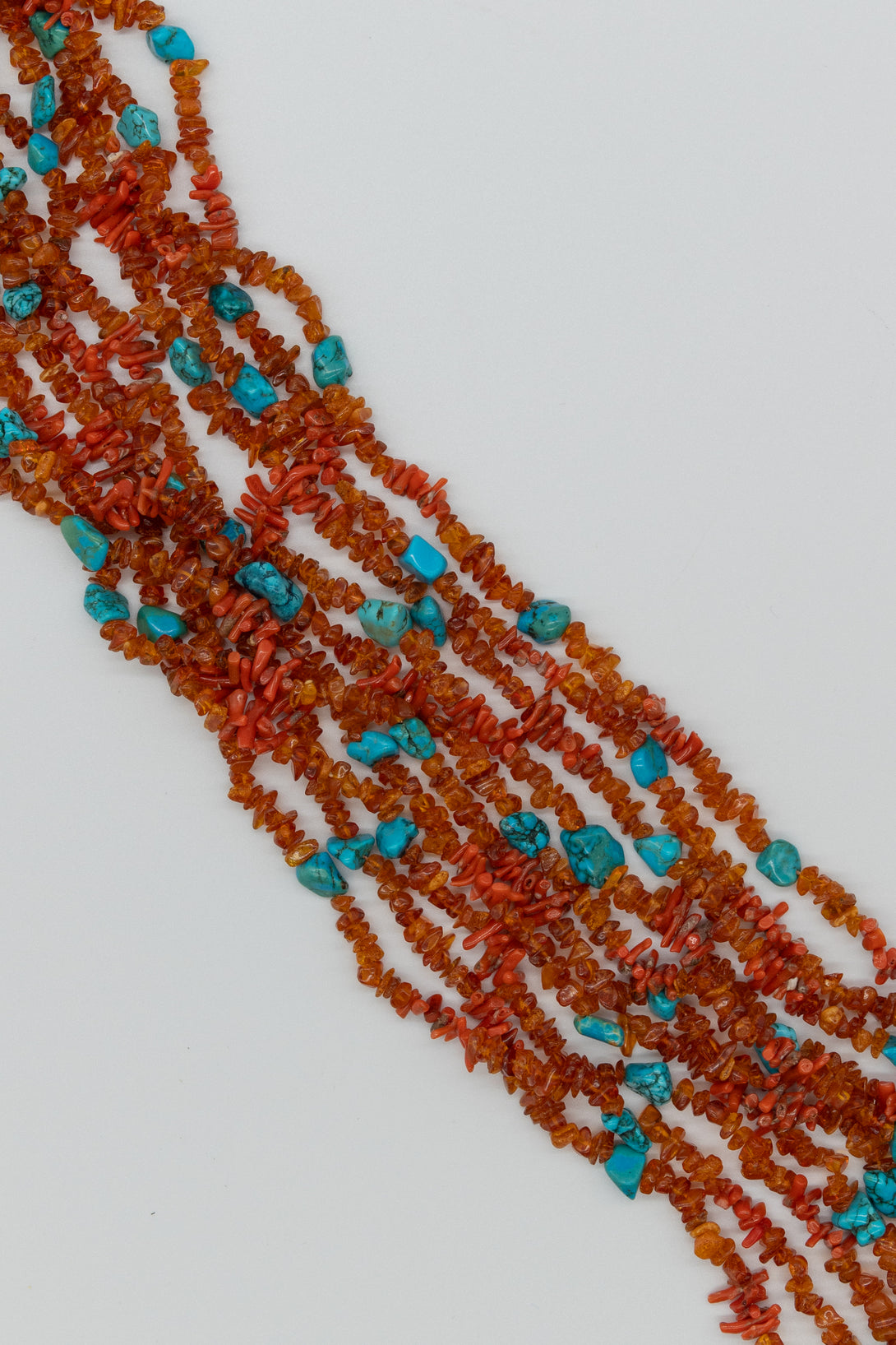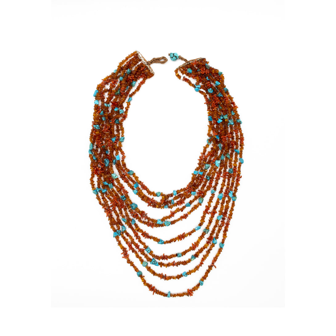 Collana Confuorto, multifilo a scalare, in ambra naturale, turchese e corallo. Chiusura con asola in bottone turchese.