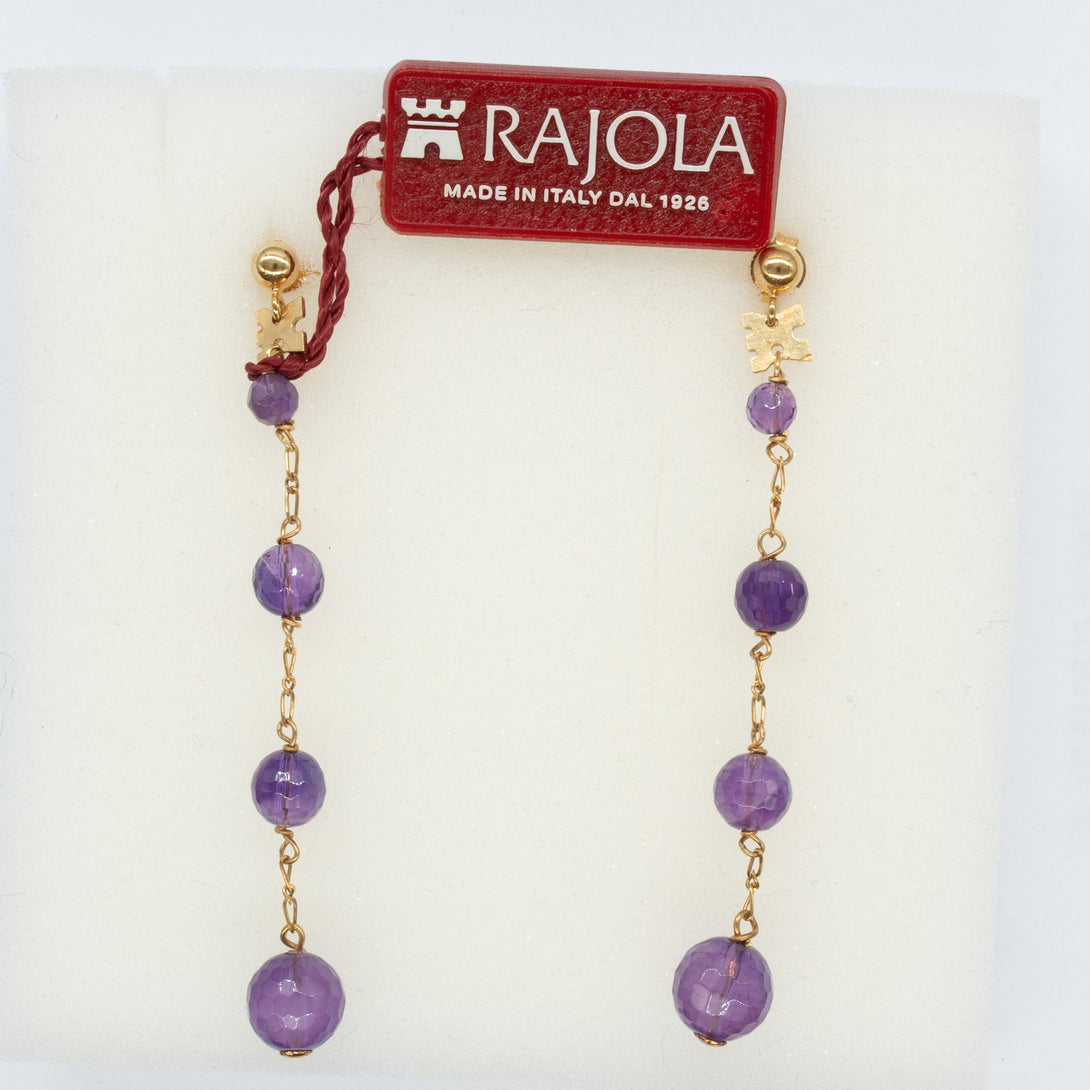 Orecchino Confuorto, collezione Arabesche, con ametista e montatura in oro. Chiusura classica con vite a farfalla. Lunghezza: 5cm.