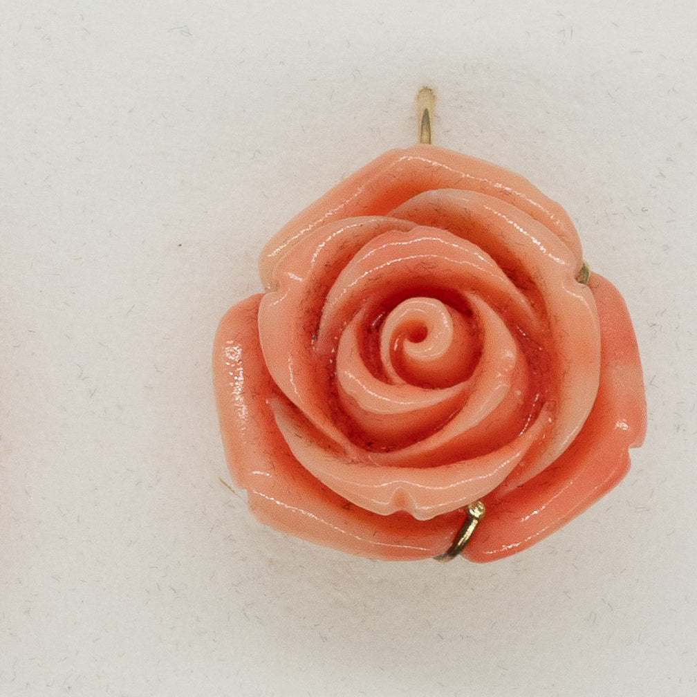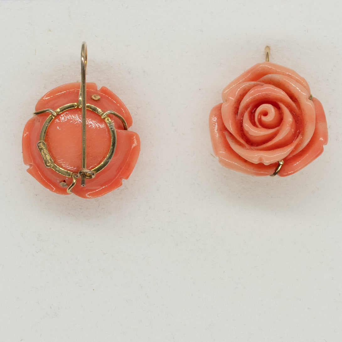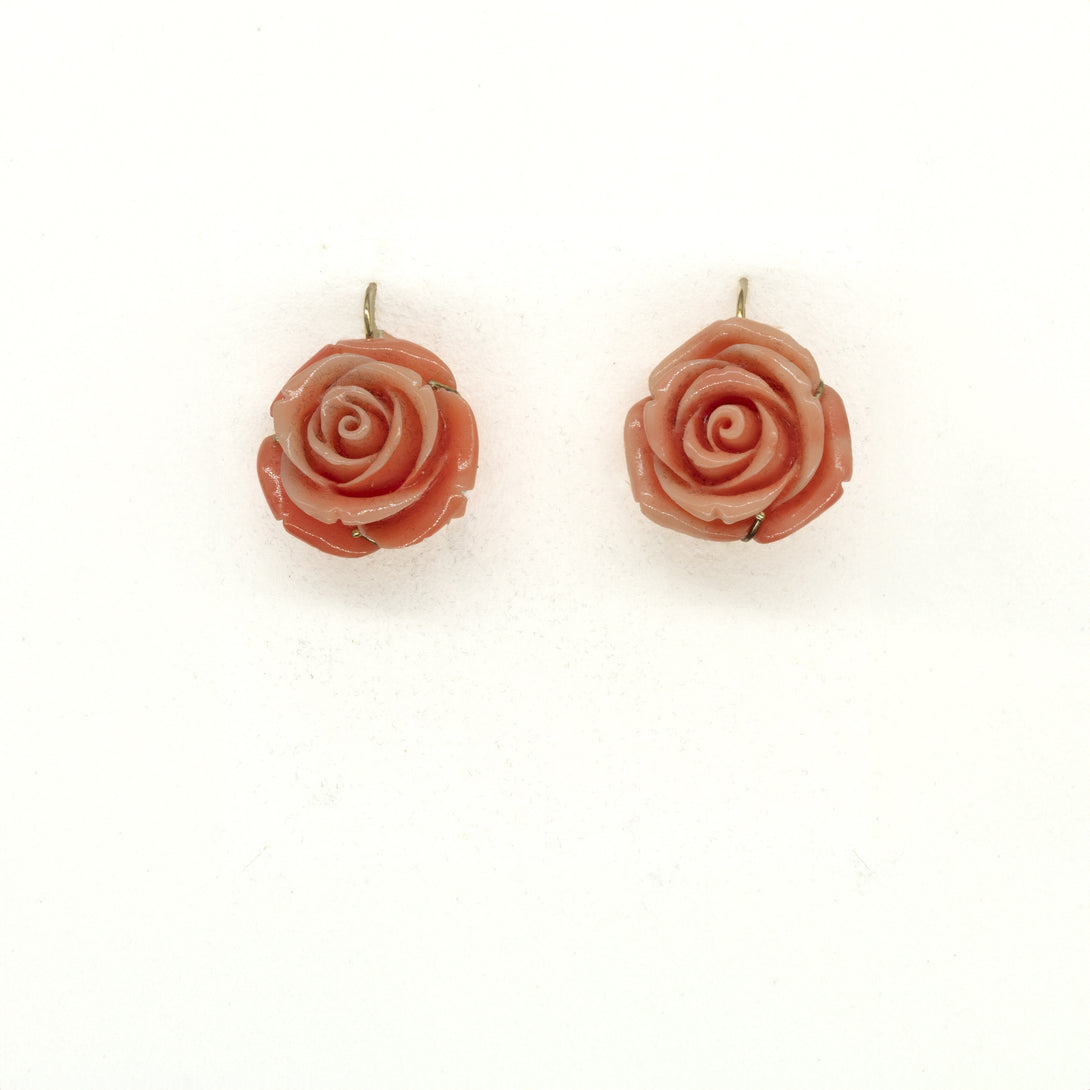 Orecchino Confuorto, con rosa in pasta di conchiglia rosa. Chiusura con monachina in argento placcato oro