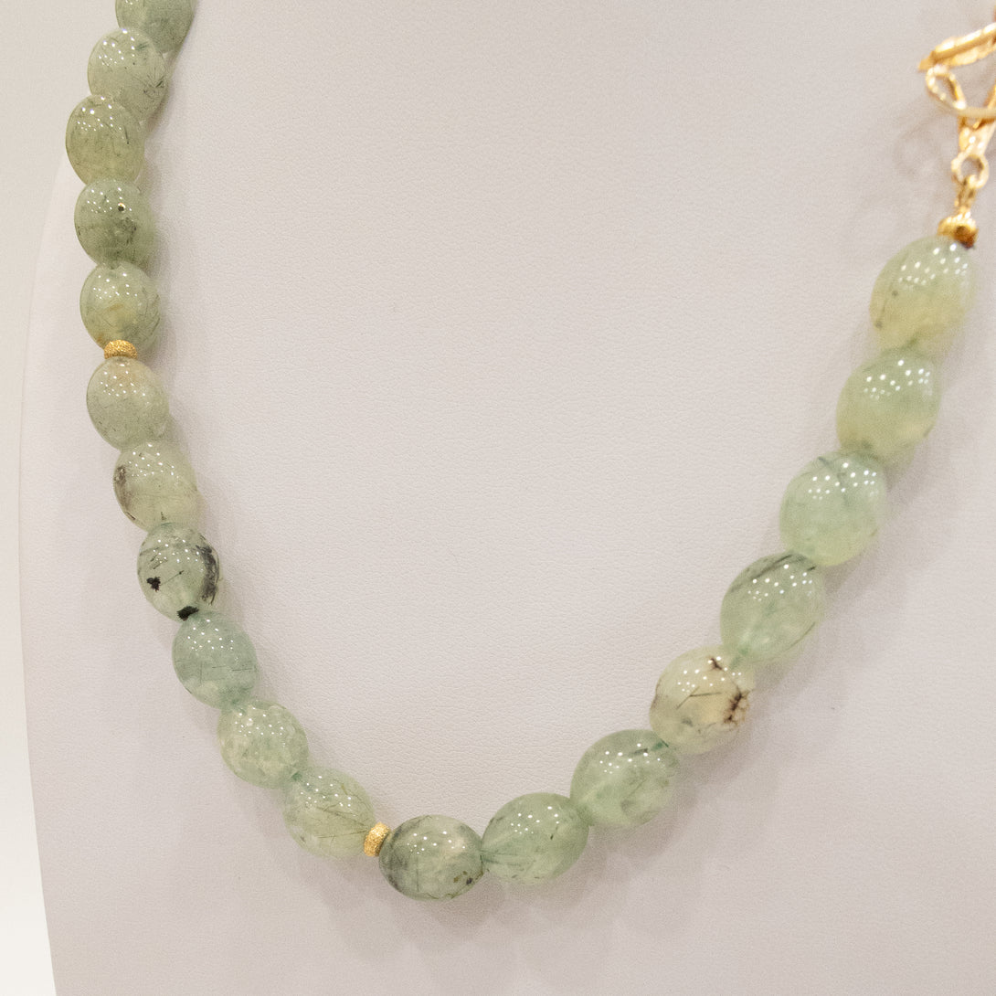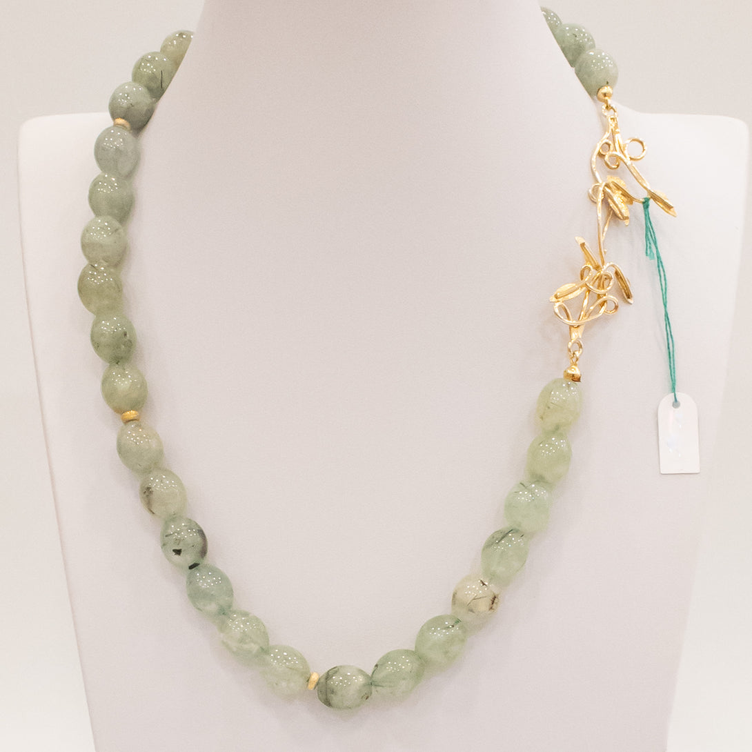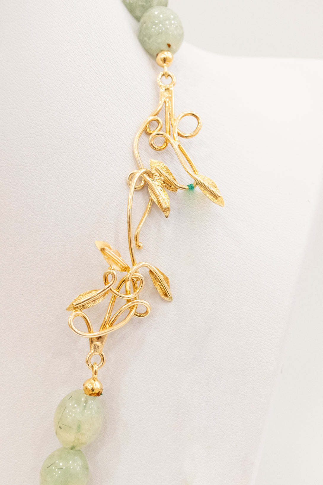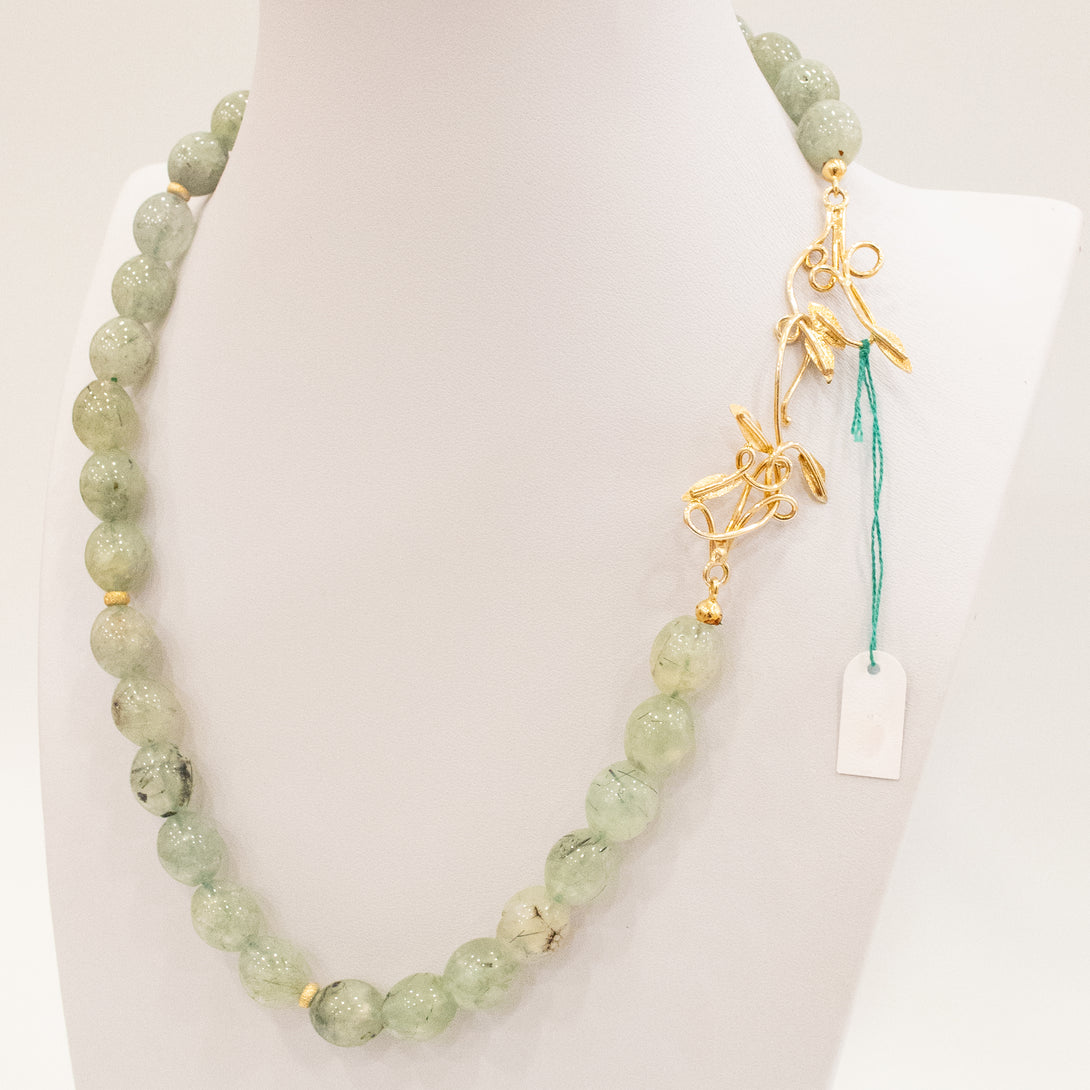 Collana girocollo Coral Waves con sfere in quarzo rutilato verde e chiusura laterale con foglia di ulivo in argento dorato.