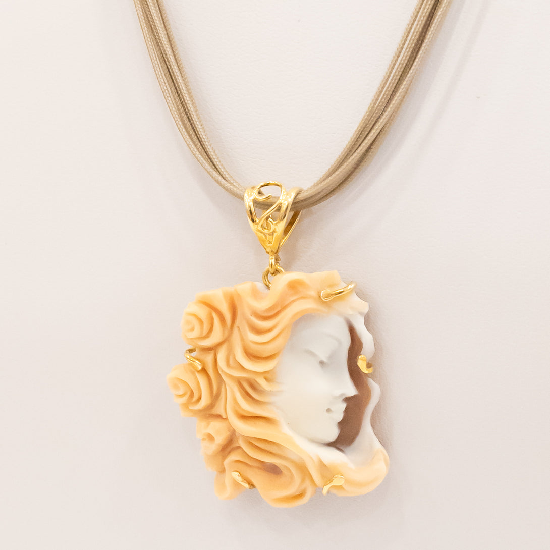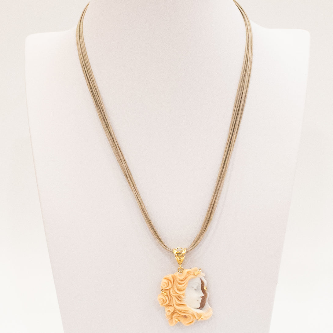 Collana girocollo Coral Waves con cordoncino in tessuto, pendente con volto di donna su cammeo realizzato a mano e dettagli dorati. Chiusura con moschettone.