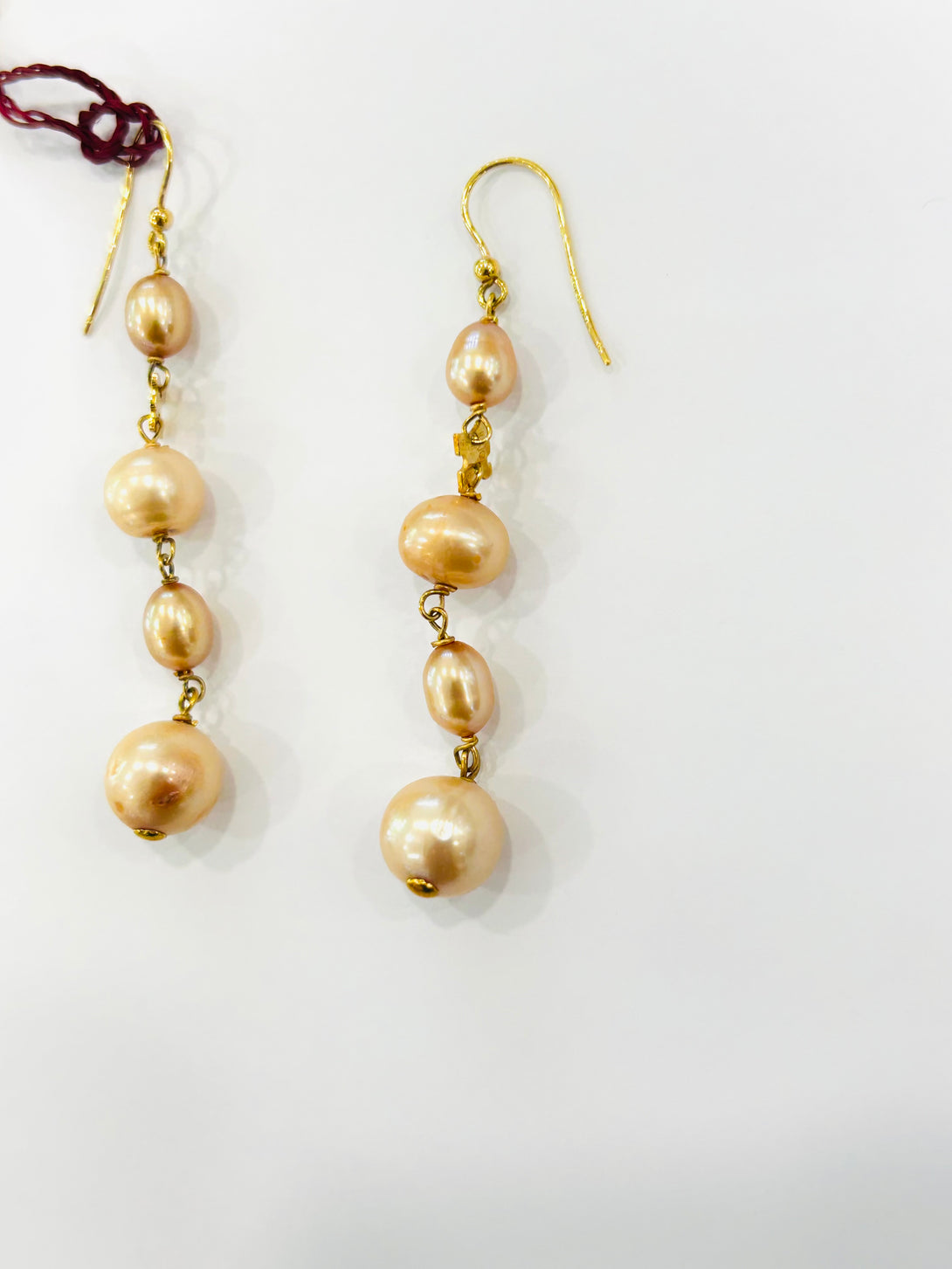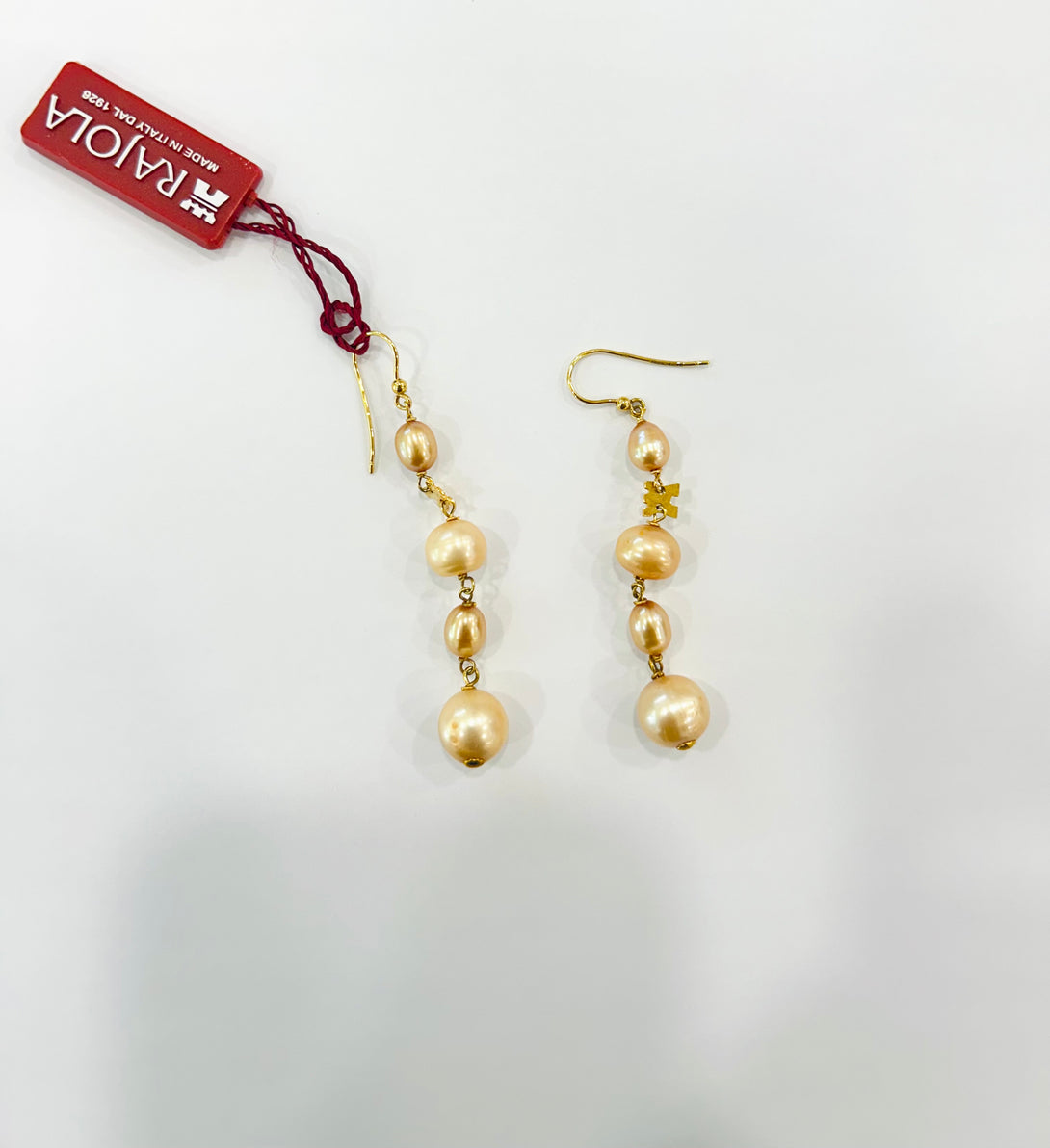 Orecchino lungo Rajola, perla Biwa dorata con chiusura con amo in oro 18kt. Lunghezza 6 cm
