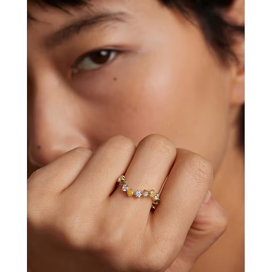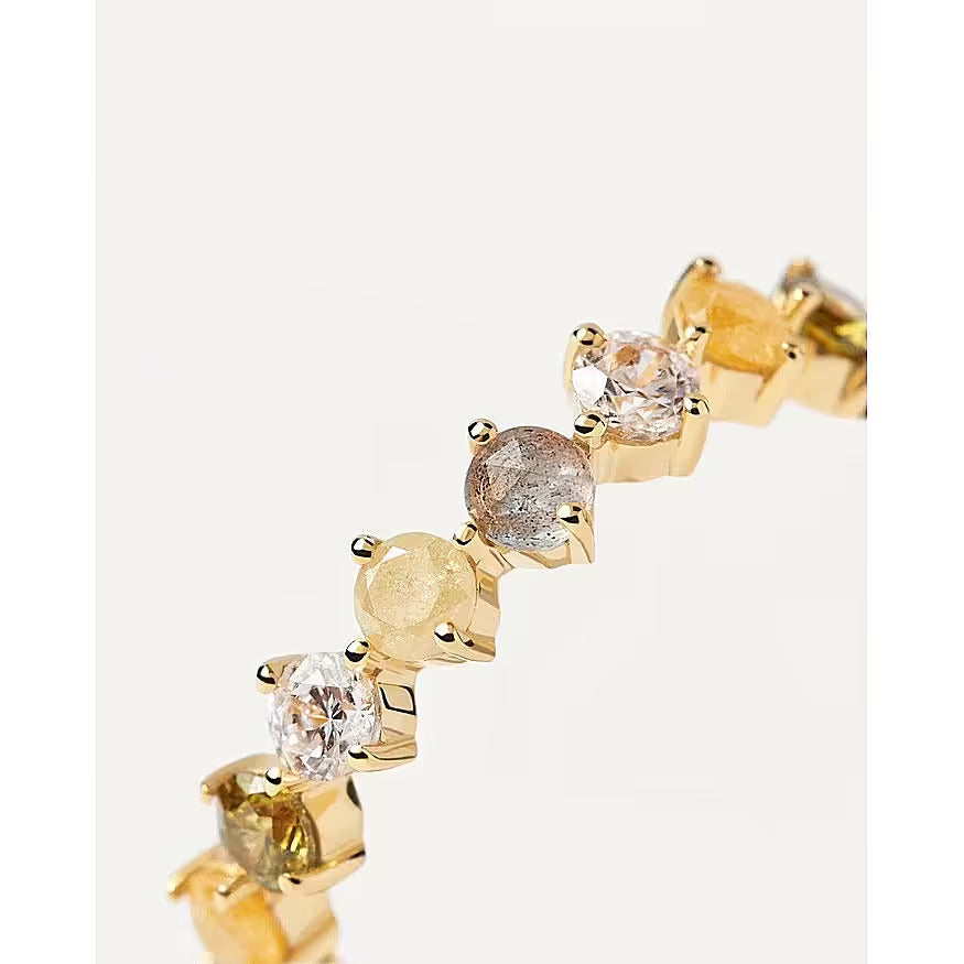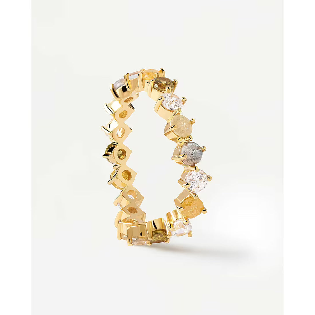 Esalta la tua eleganza con l'Anello April Gold della prestigiosa collezione Juno di PDPAOLA. Realizzato con maestria in pregiato argento sterling 925 e placcato con l'aura lussuosa dell'oro 18k, questo gioiello incanta con una raffinata combinazione di pietre preziose. La labradorite, con la sua iridescenza misteriosa, si unisce all'eleganza delle zirconie gialle, bianche e verdi, accarezzando lo sguardo con una luminosità unica. Il design sofisticato e la misura 16 conferiscono un tocco di glamour senza tempo. Eleva il tuo stile con la referenza esclusiva, e lasciati avvolgere dall'aura di raffinata bellezza che solo PDPAOLA può offrire.