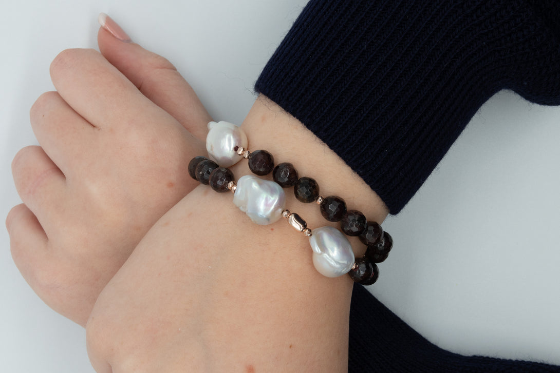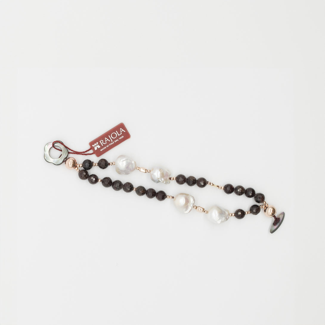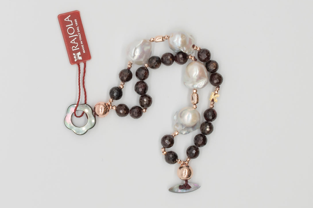 Bracciale Rajola, collezione Vita, 2 fili, in granato, perle barocche ed ematite rosa. Chiusura con asola in madreperla.