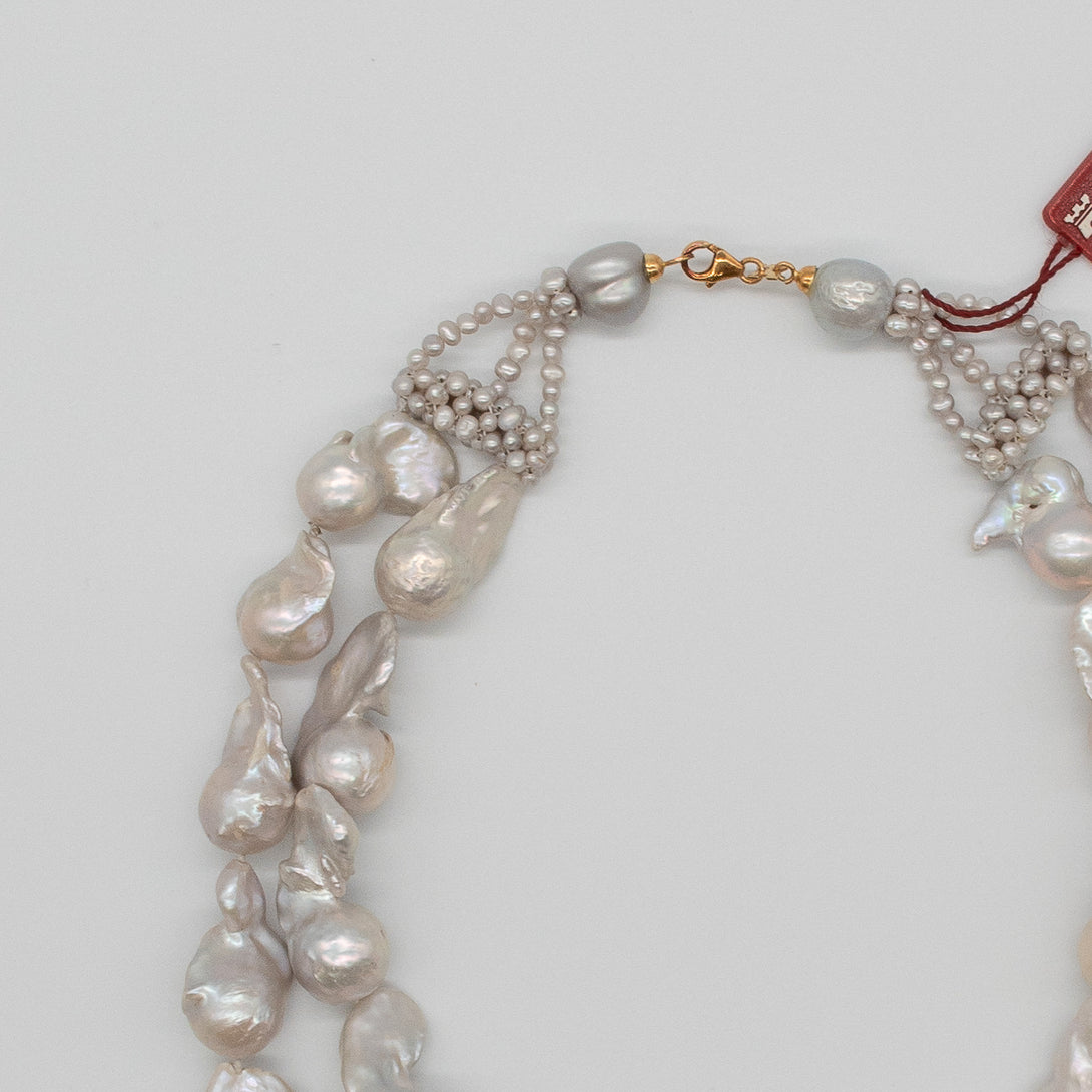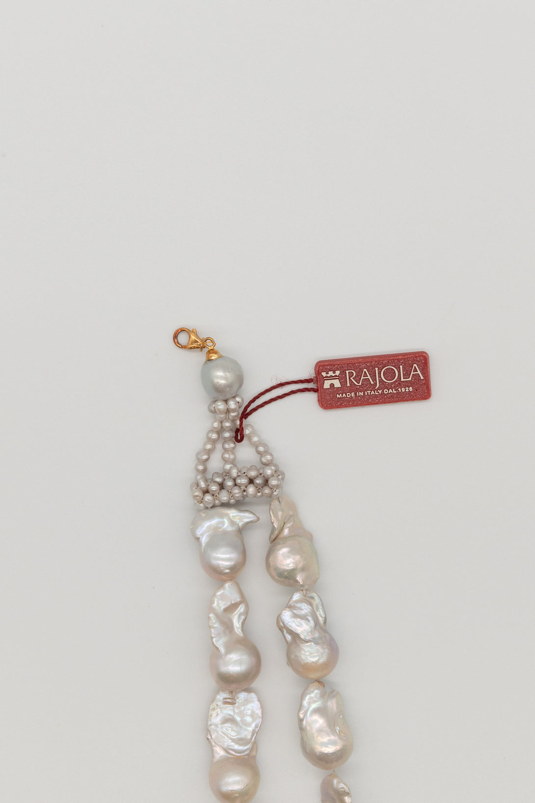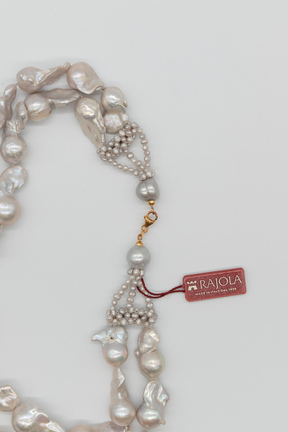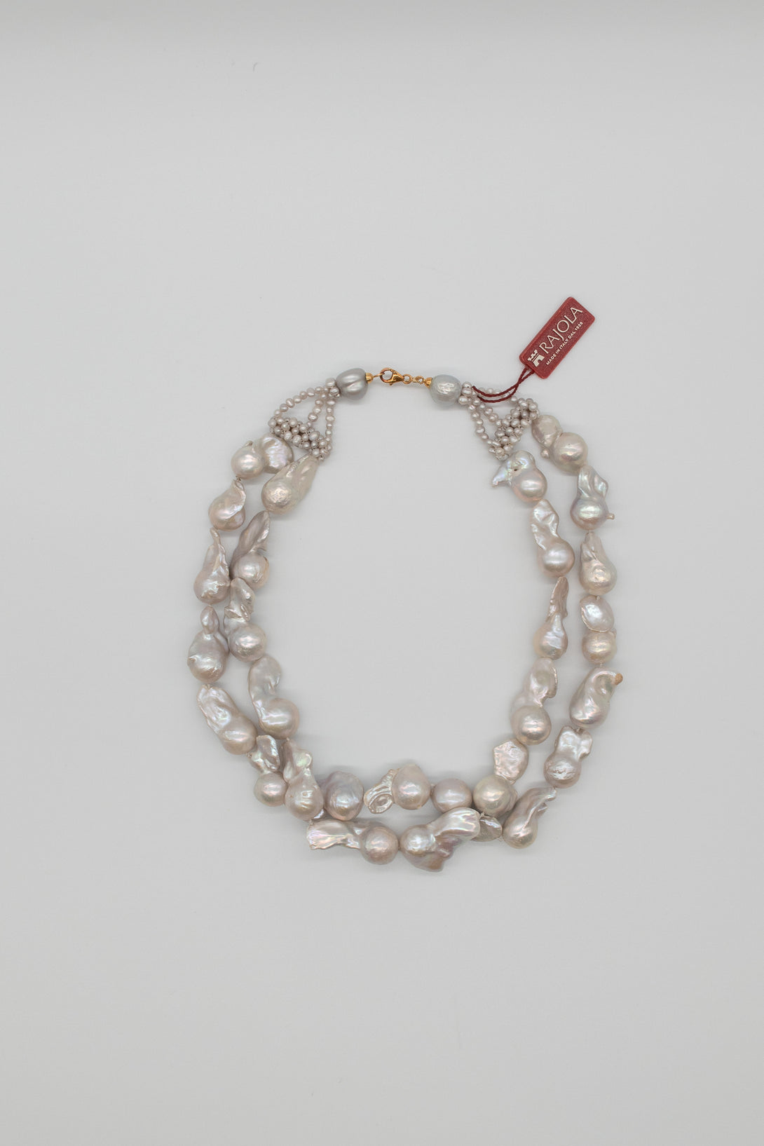 Collana girocollo Rajola collezione Easy, 2 fili, con perla barocca grigia. Chiusura con moschettone in oro.
