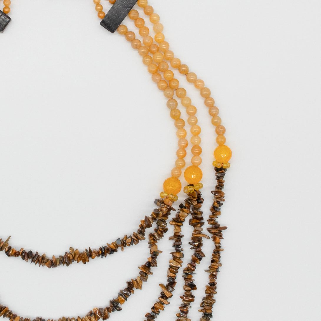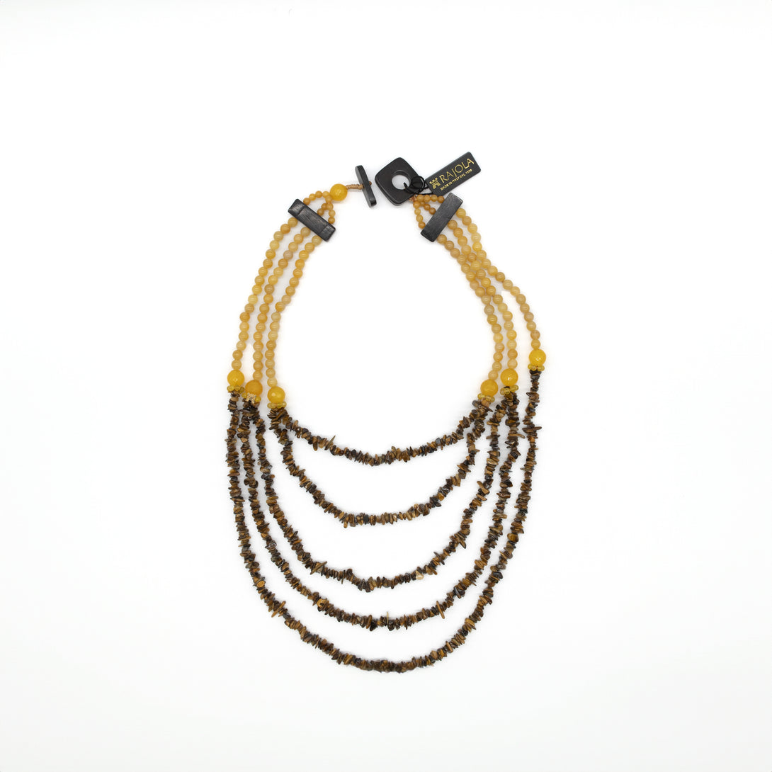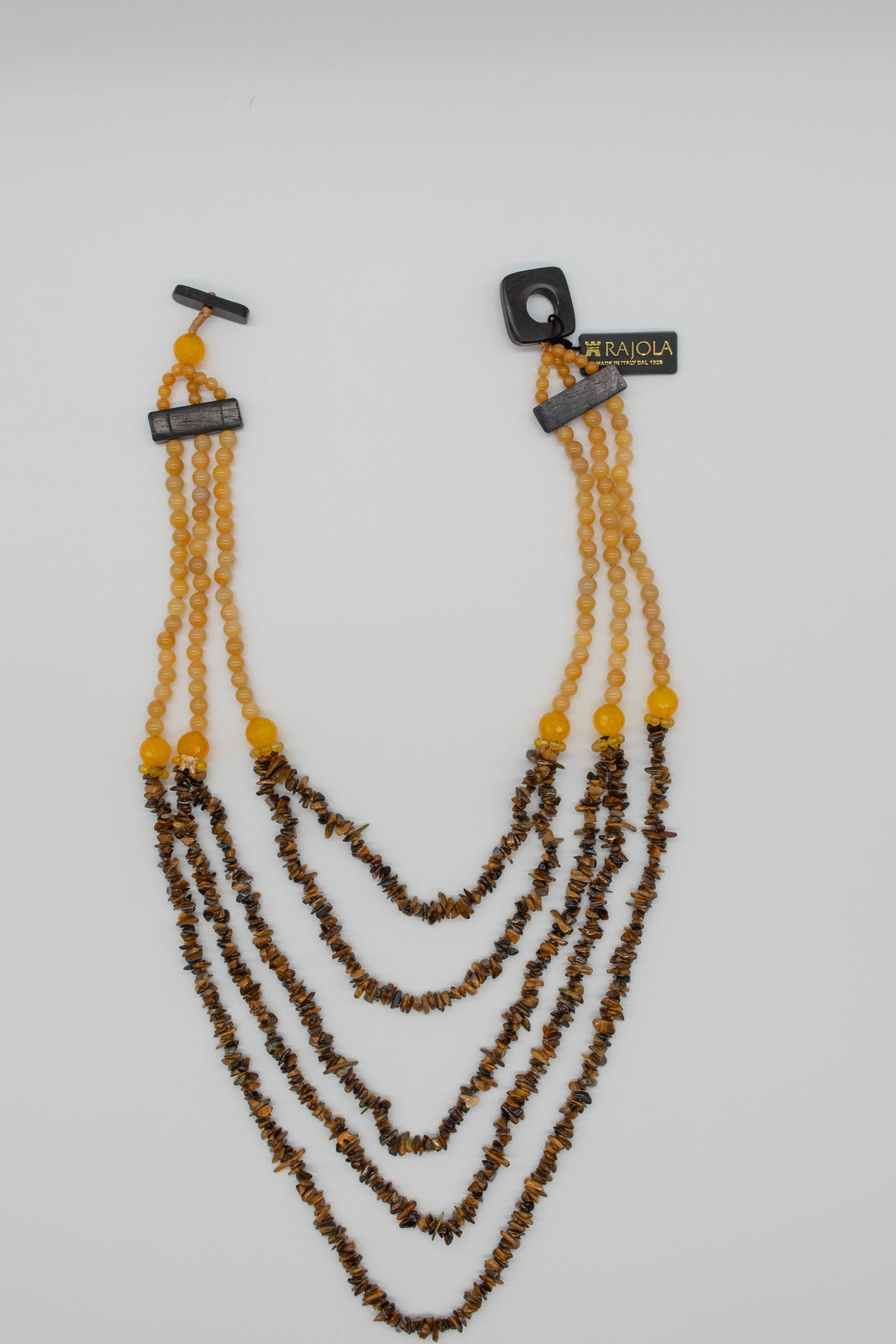 Collana Rajola, collezione Mambo, con tre fili in agata gialla e cinque fili in occhio di tigre, a scalare. Chiusura con asola in ebano. Collana corta.