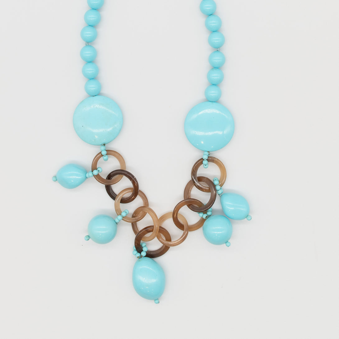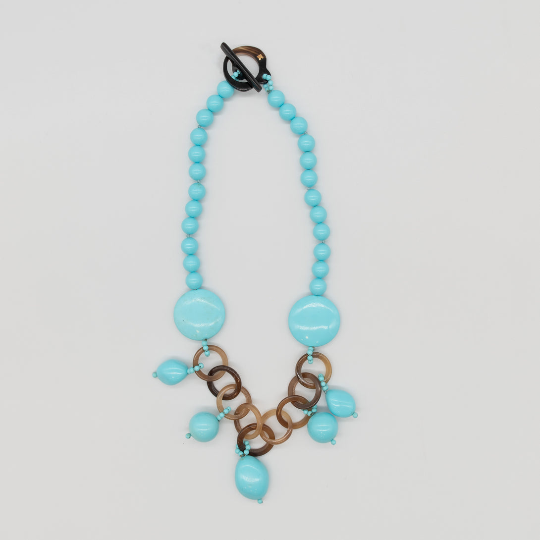 Collana Rajola collezione Safari girocollo in pasta di turchese e anelli in corno naturale. Chiusura con asola in corno