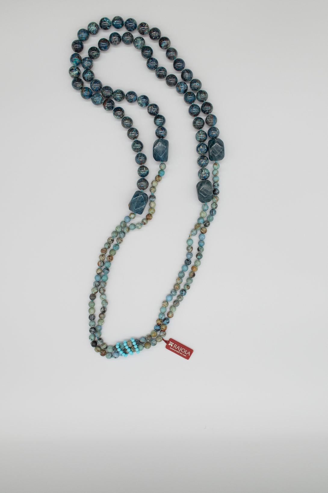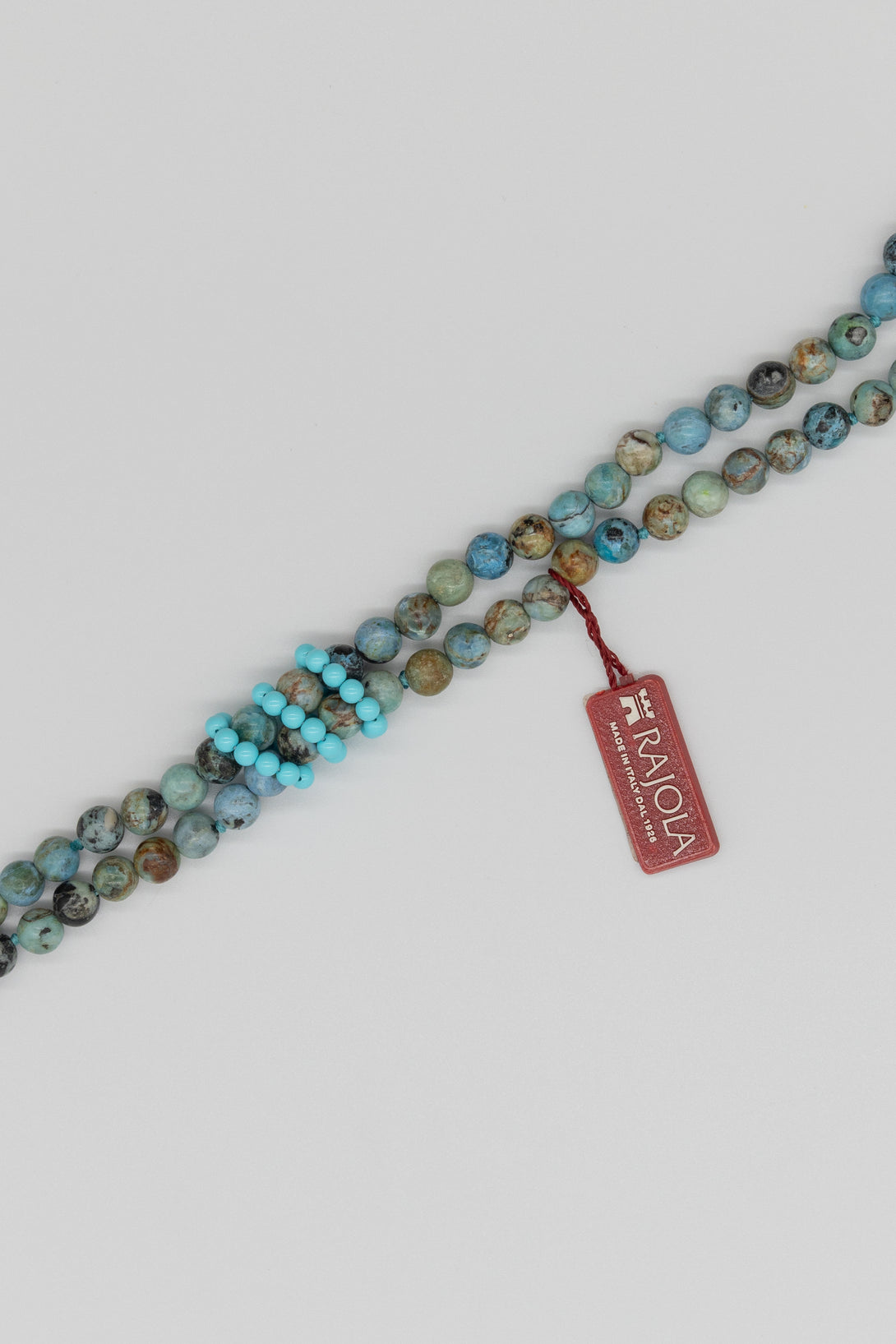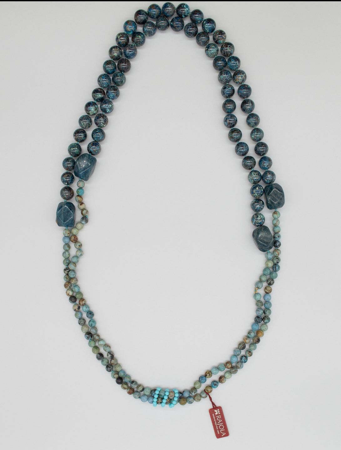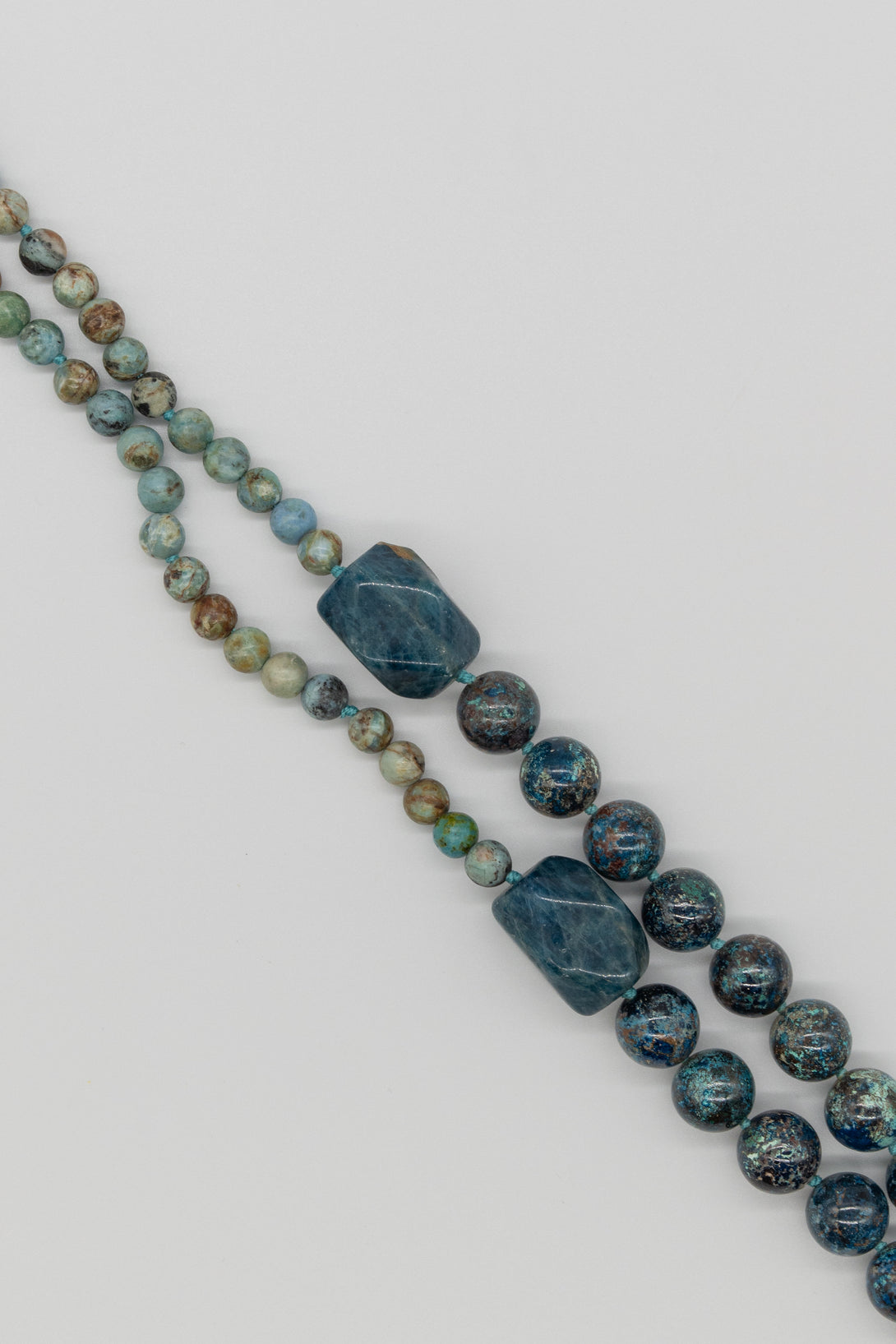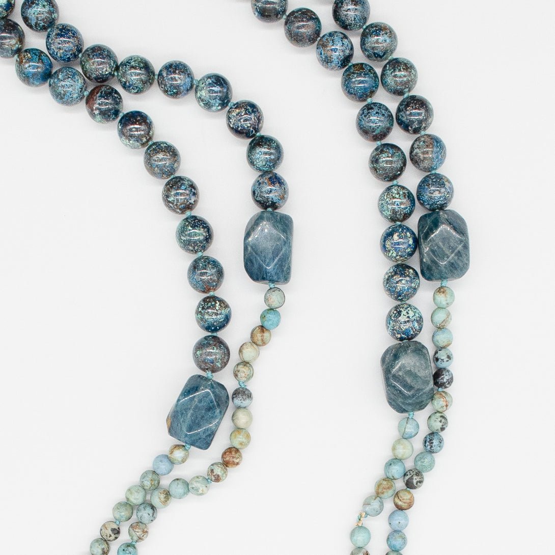 Collana Rajola collezione Siria, due fili, con opale peruviano blu, crisocolla, apatite e tris di anelli in pasta di turchese. Unico giro da 45cm