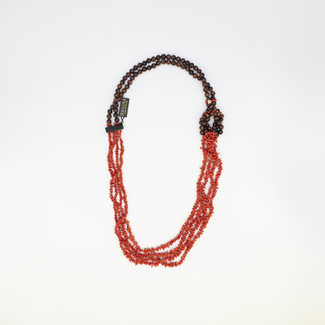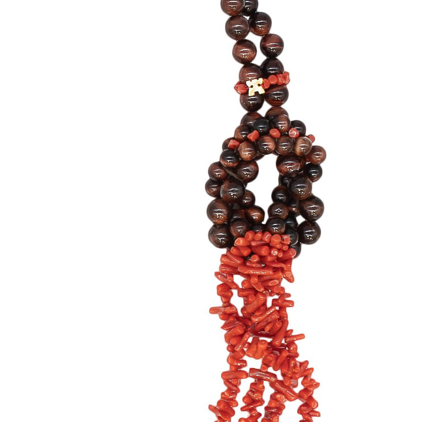 Collana Rajola collezione Abbracci con corallo rosso, occhio di tigre ed ebano. Unico giro da 45cm.