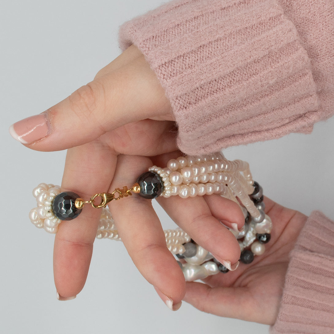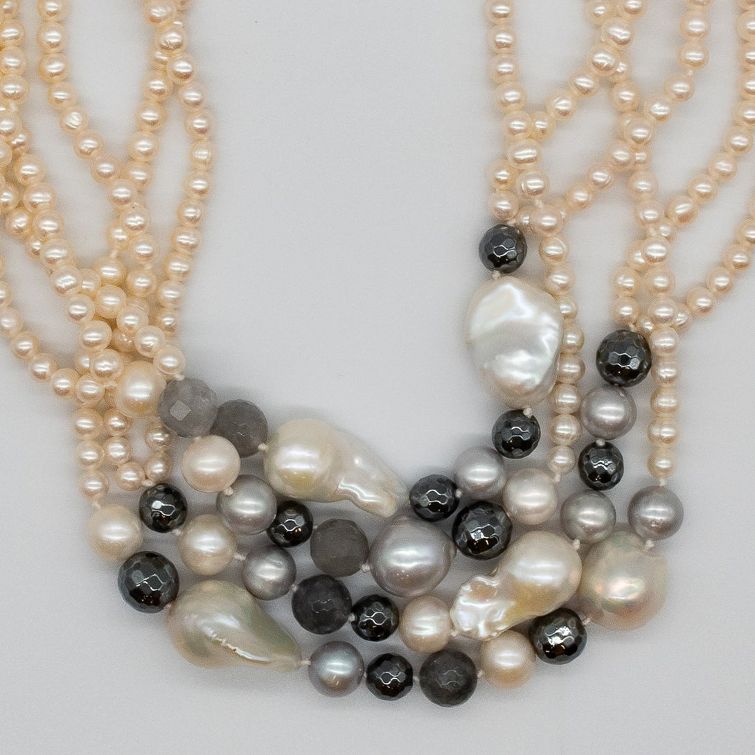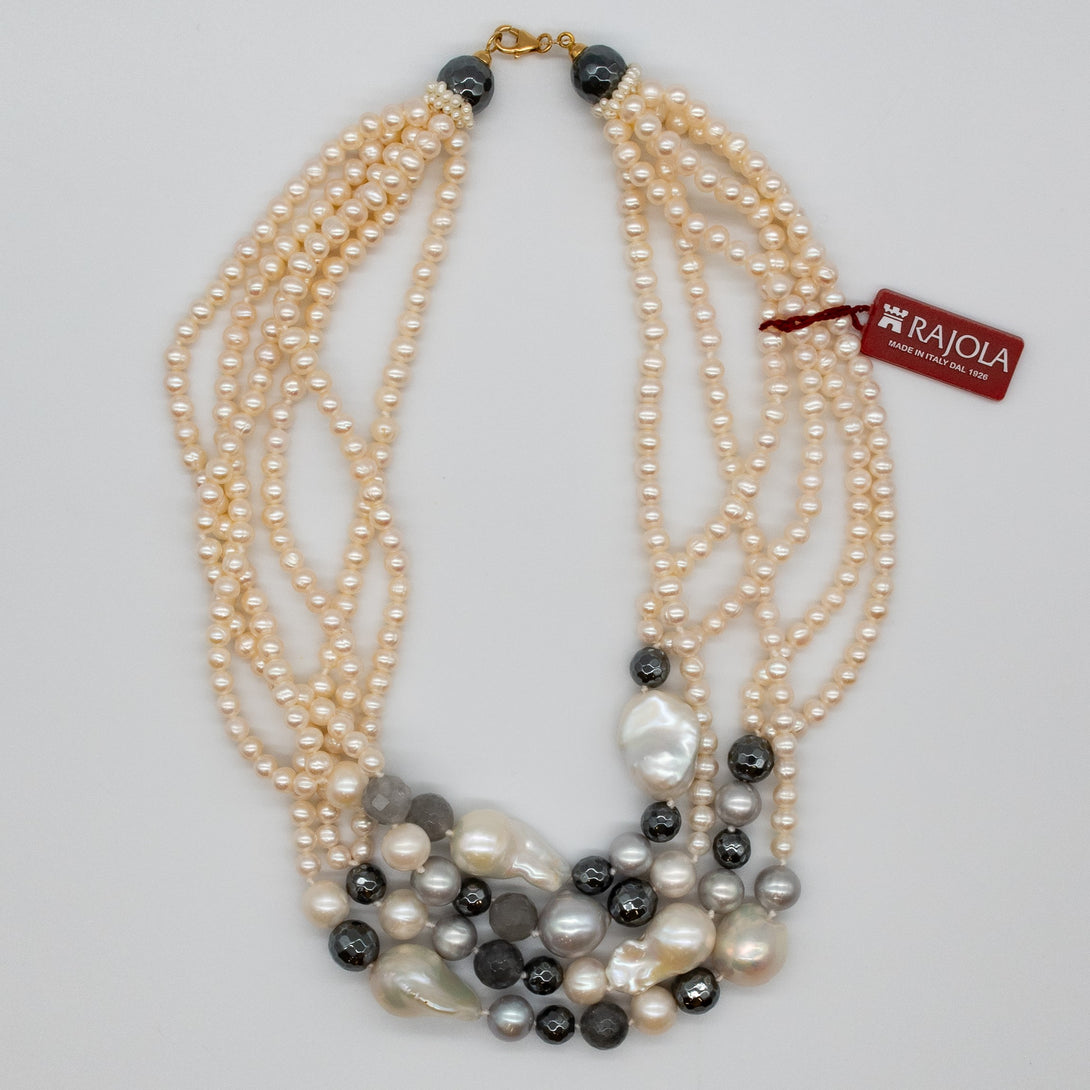 Collana girocollo Rajola collezione Bloom, 6 fili, con perle di fiume, quarzo grigio ed ematite. Chiusura in oro.