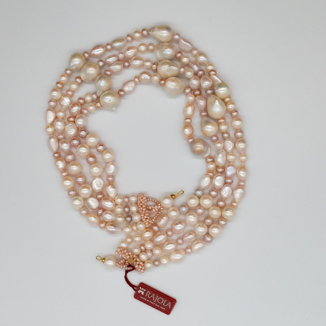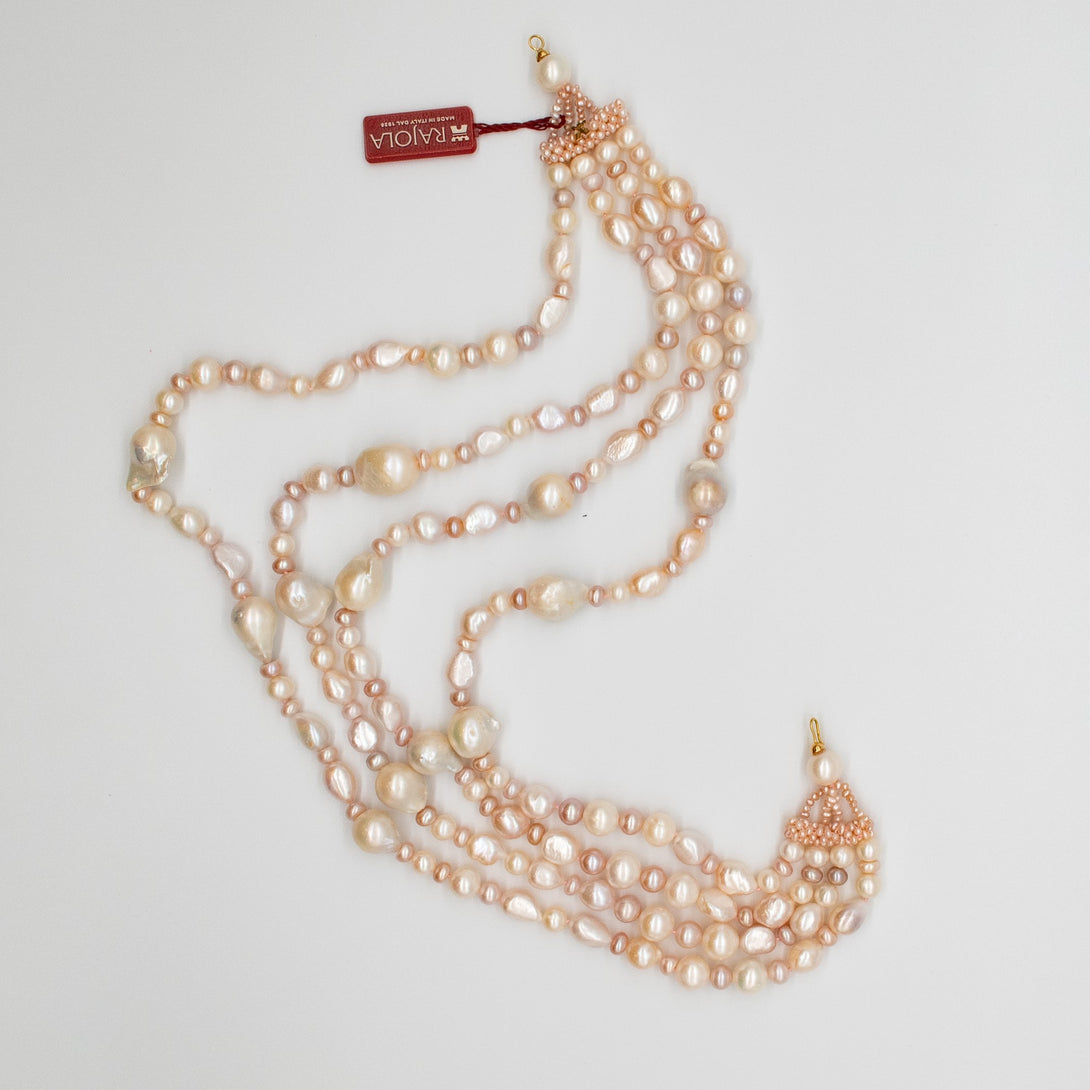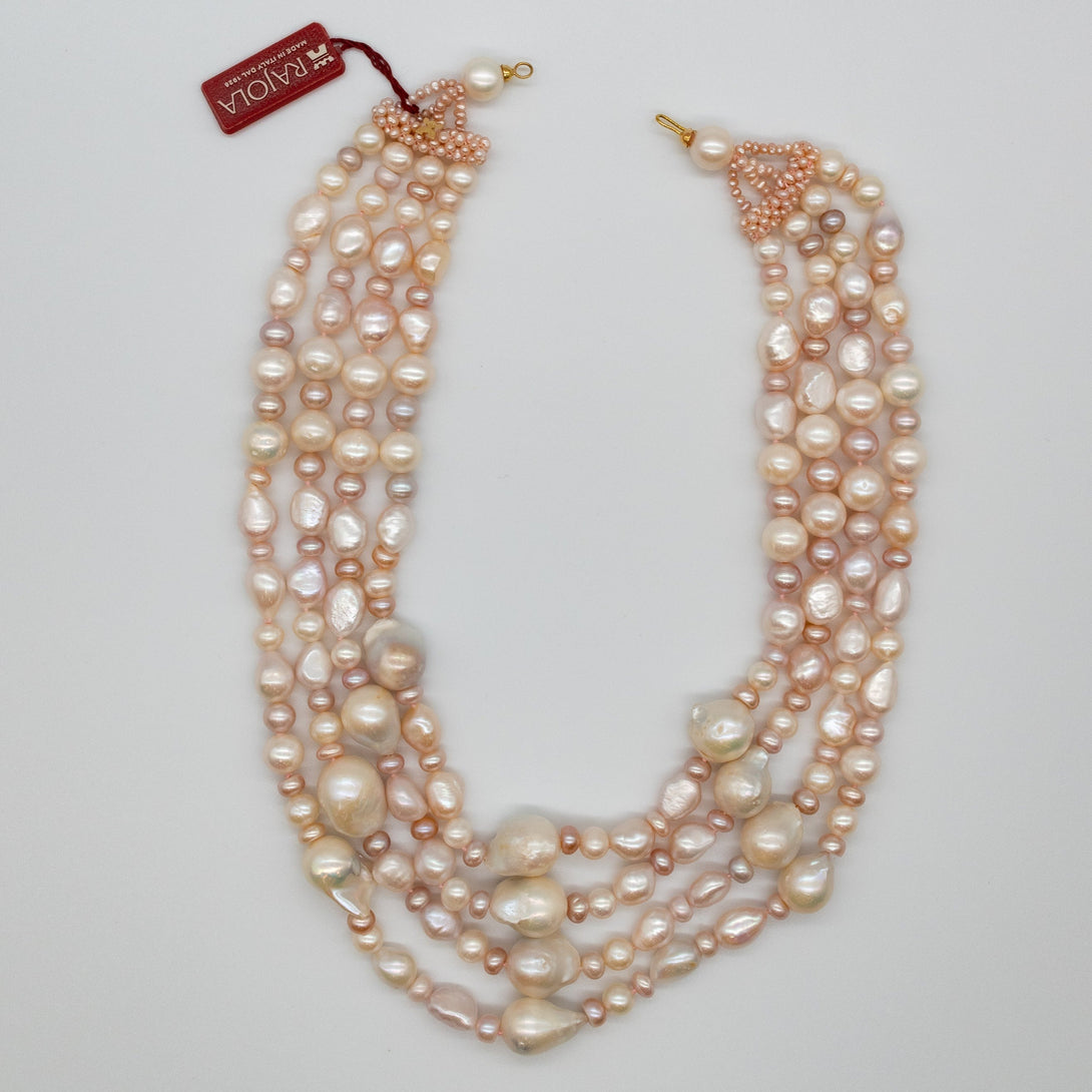 Collana girocollo Rajola collezione Lucrezia 4 fili con perla biwa rosa. Chiusura in oro.
