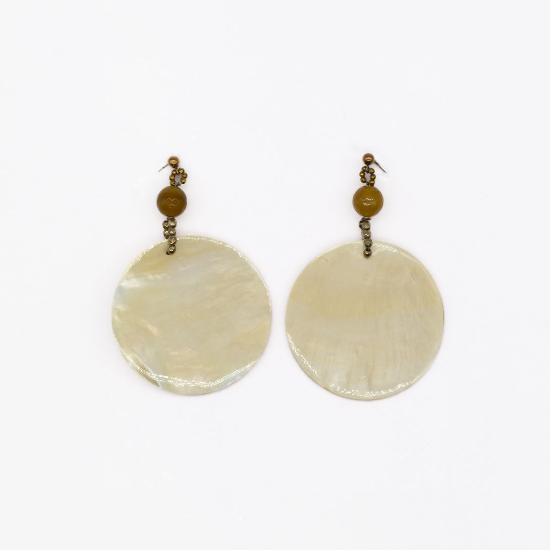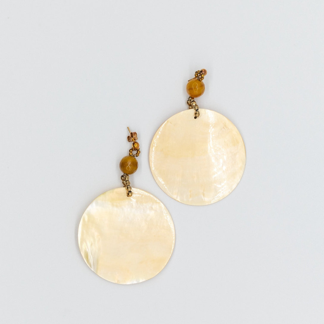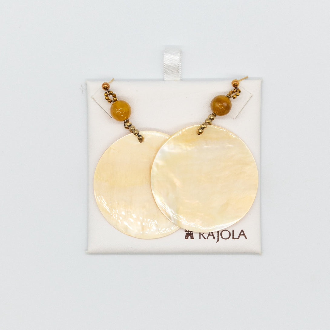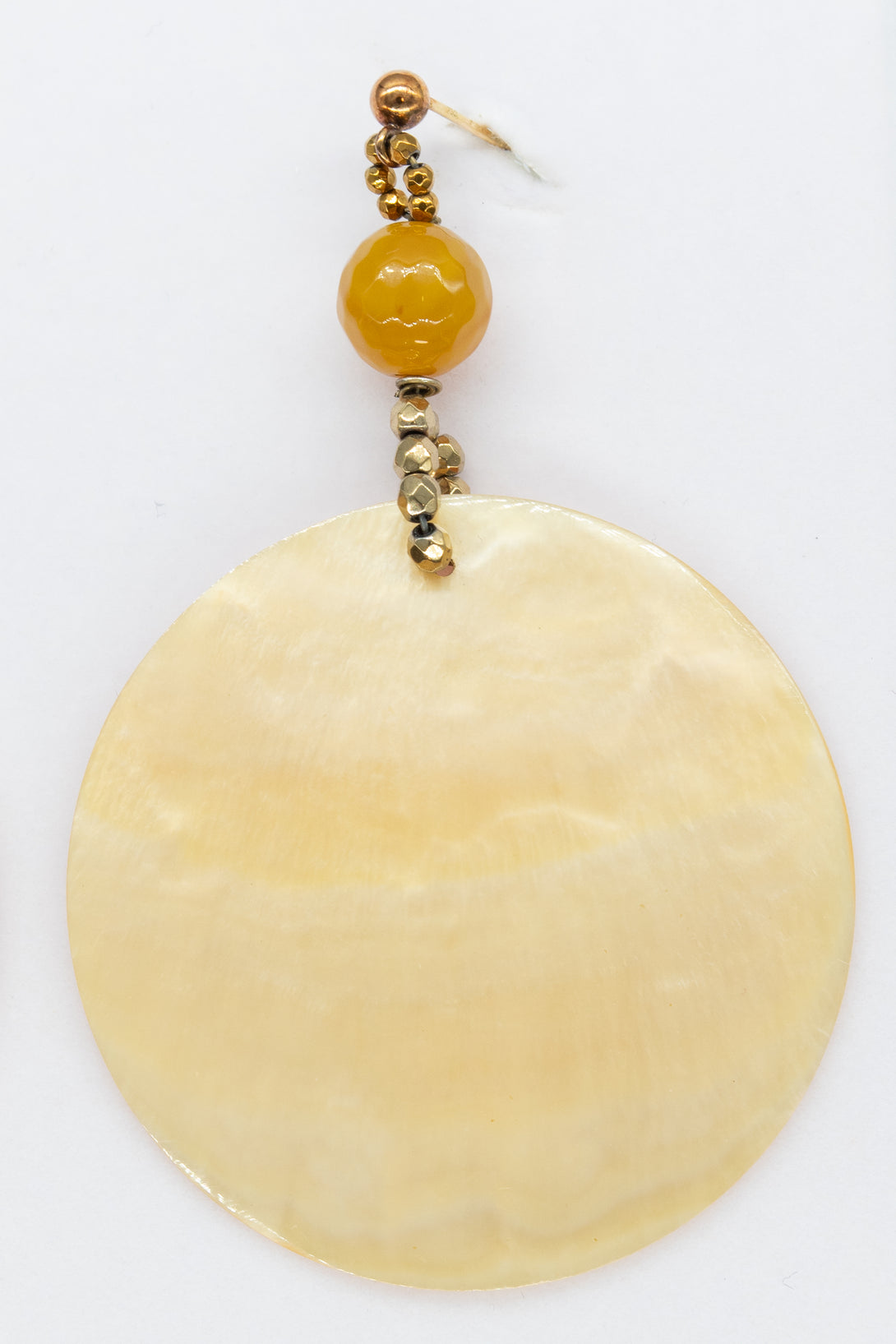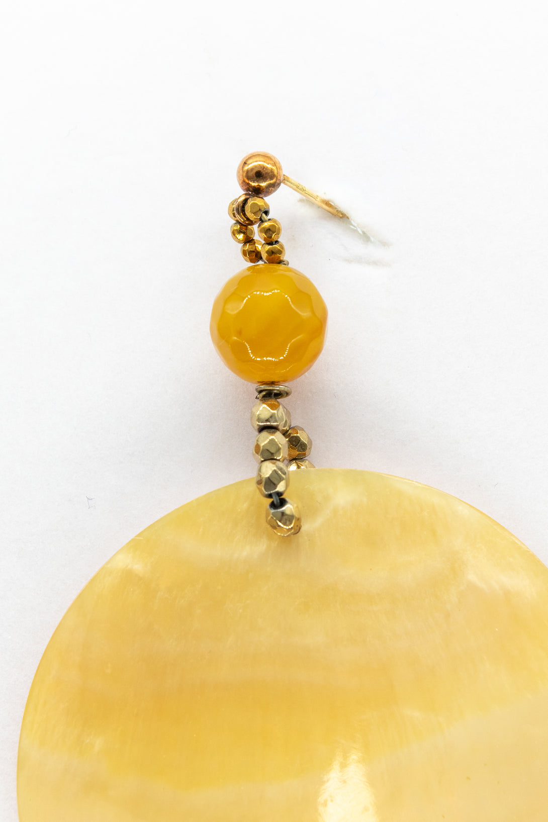 Orecchino Rajola, collezione Harem, in agata gialla, ematite e madre perla. Montatura in oro. Classica chiusura con vite a farfalla.