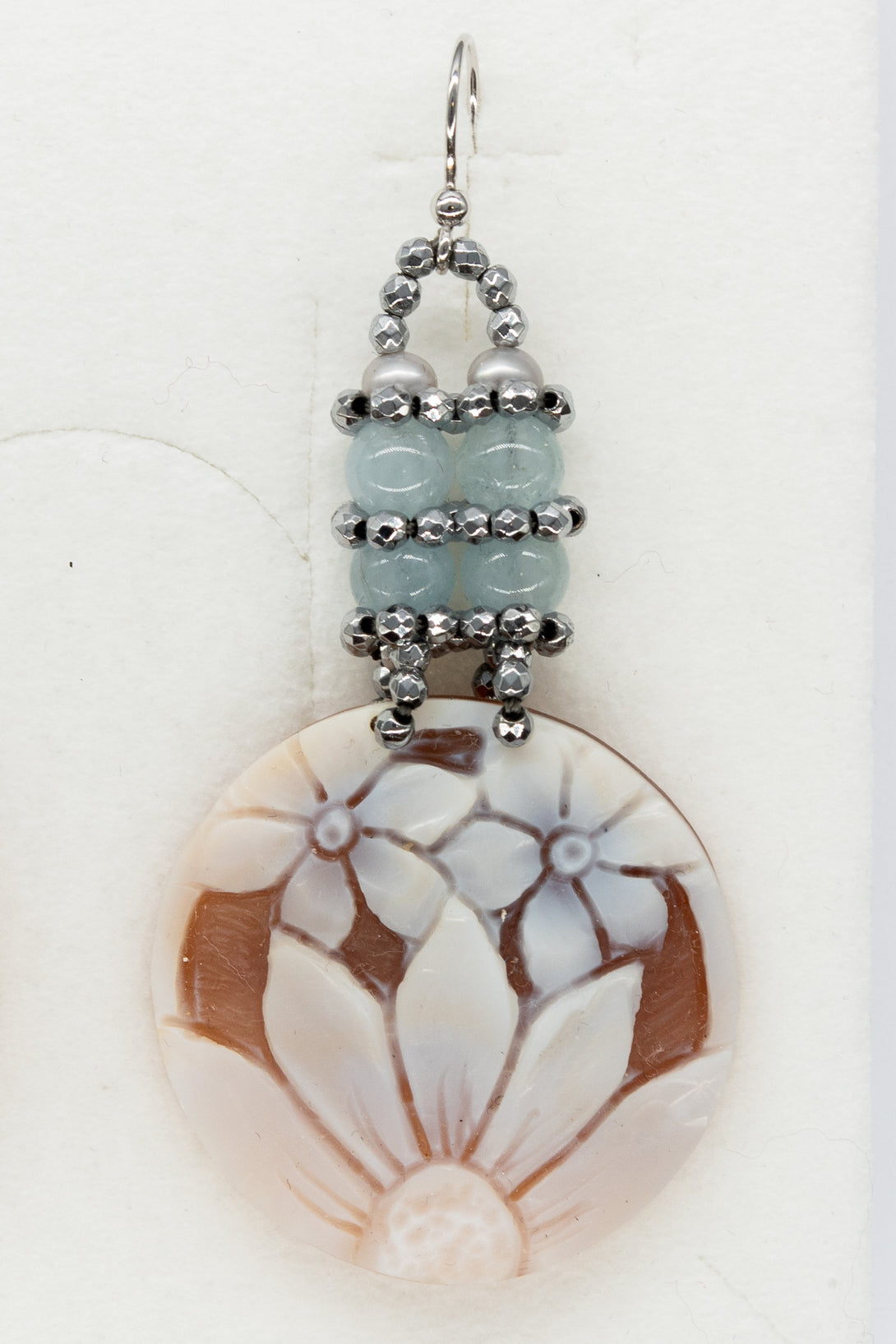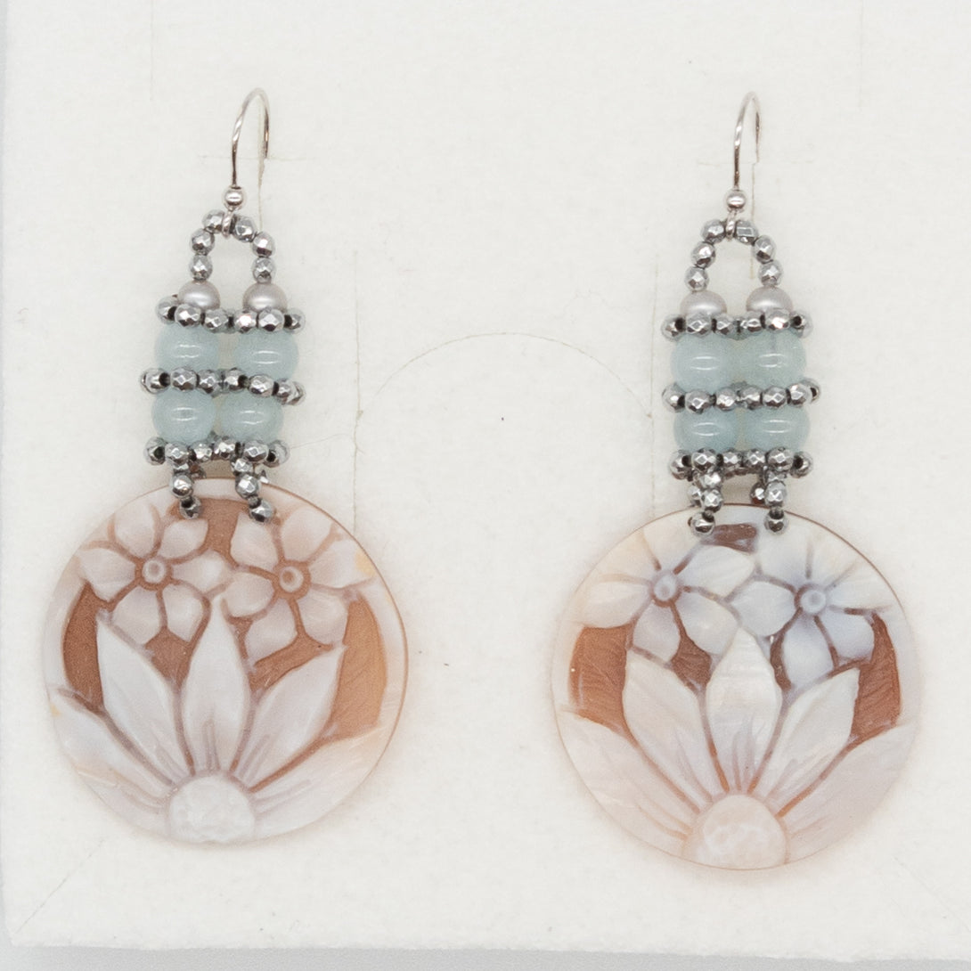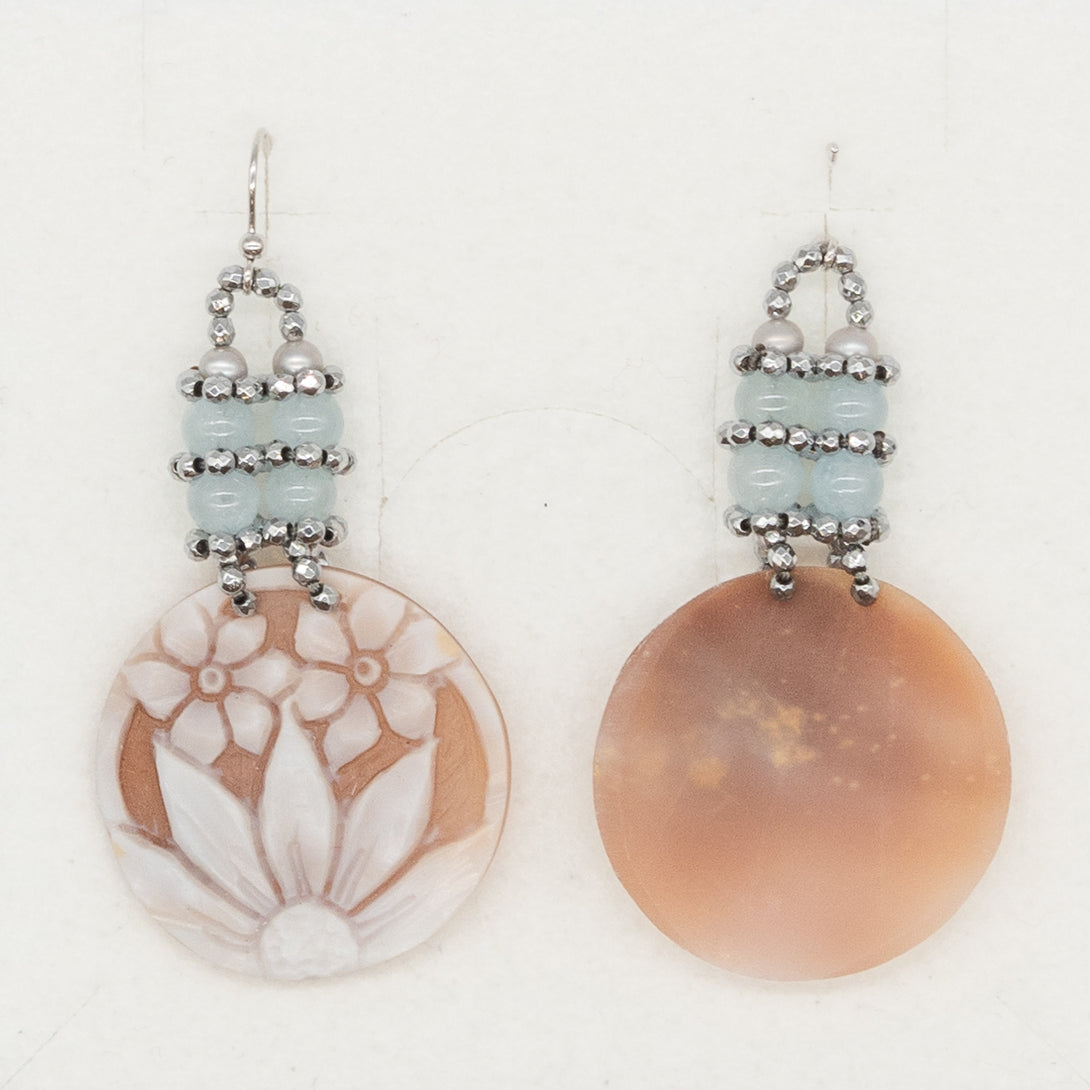 Orecchino Rajola, collezione Malia, con cammeo realizzato a mano, perle grigie e acquamarina. Chiusura a monachina in oro bianco.